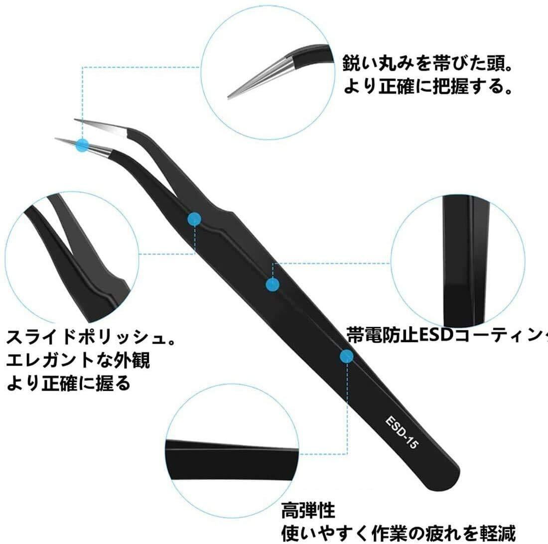 ピンセット[ESD-15]:先曲タイプ、狭い場所での作業に使える(124mm/4.88in)。