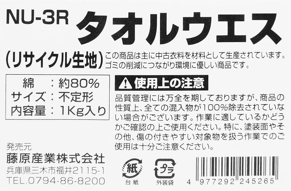・タオルウエスは、タオルやタオルケット、バスタオルなどのパイル生地でできている、生地を選別して裁断加工しており、大量の水や油もよく吸い取る