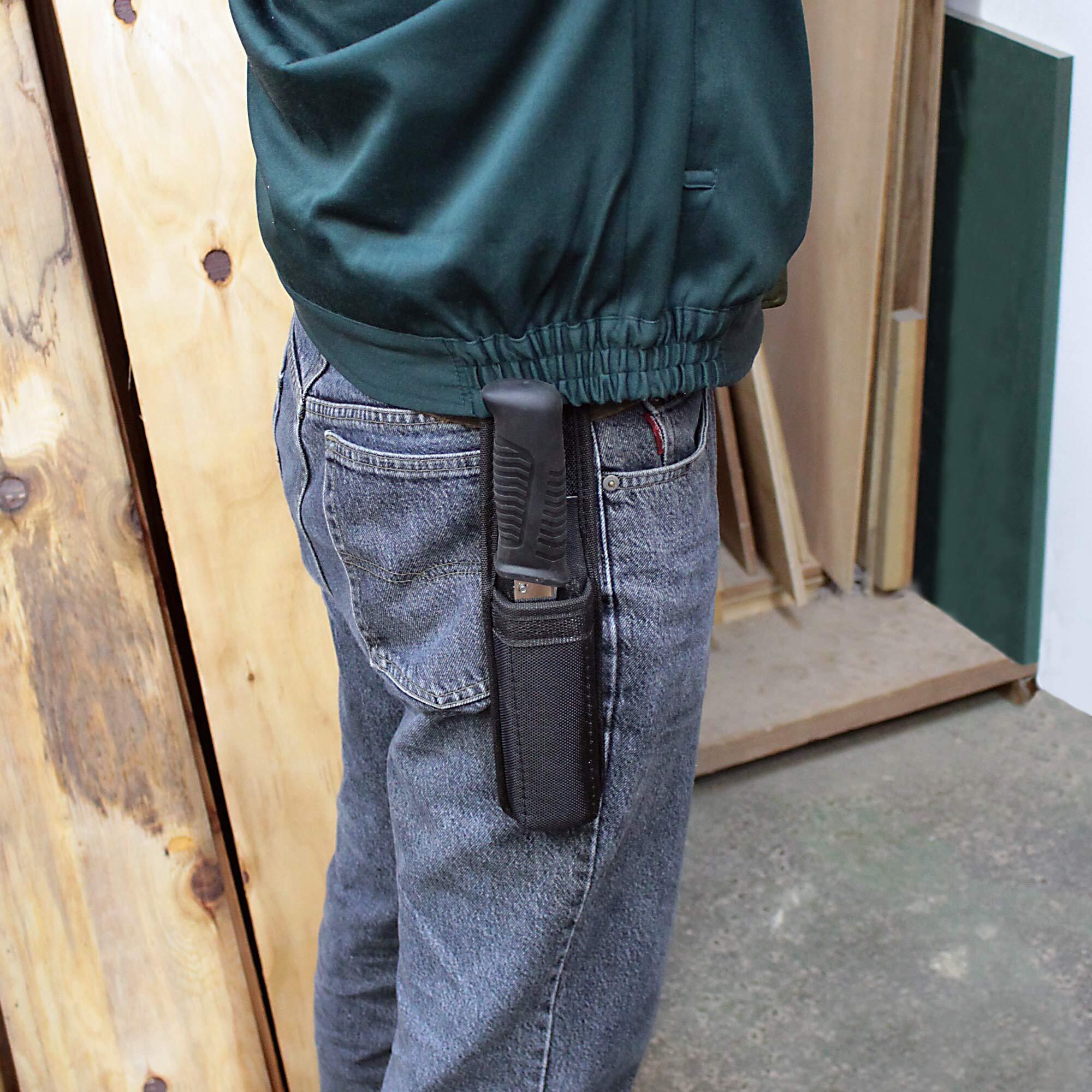 特徴②:専用サック付です。腰袋が干渉するような壁間の狭い現場での防水シート貼りなどで手返し良く作業出来ます。保管時の製品保護にも便利です。