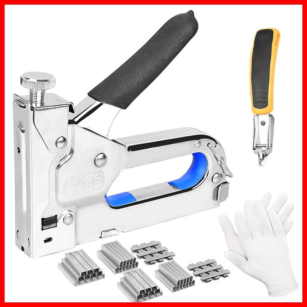 【三種類替針対応】T型(10-14mm)・U型(10-12mm)・コ型(4-14mm)の替針対応可能。ステープルガン本体サイズ:幅15.5×高さ11.5×厚さ2.4cm、セット内容:ガンタッカー*1、ステープルリムーバー*1、手袋*1、ステープル(コ型・U型・T型)・各1000枚。