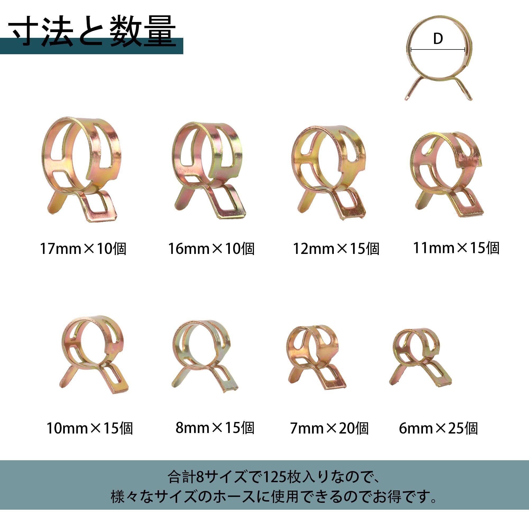 お得セット:6mm、7mm、8mm、10mm、11mm、12mm、 16mm、17mm内径合計8サイズで125枚入りなので、様々なサイズのホースに使用できるのでお得です。