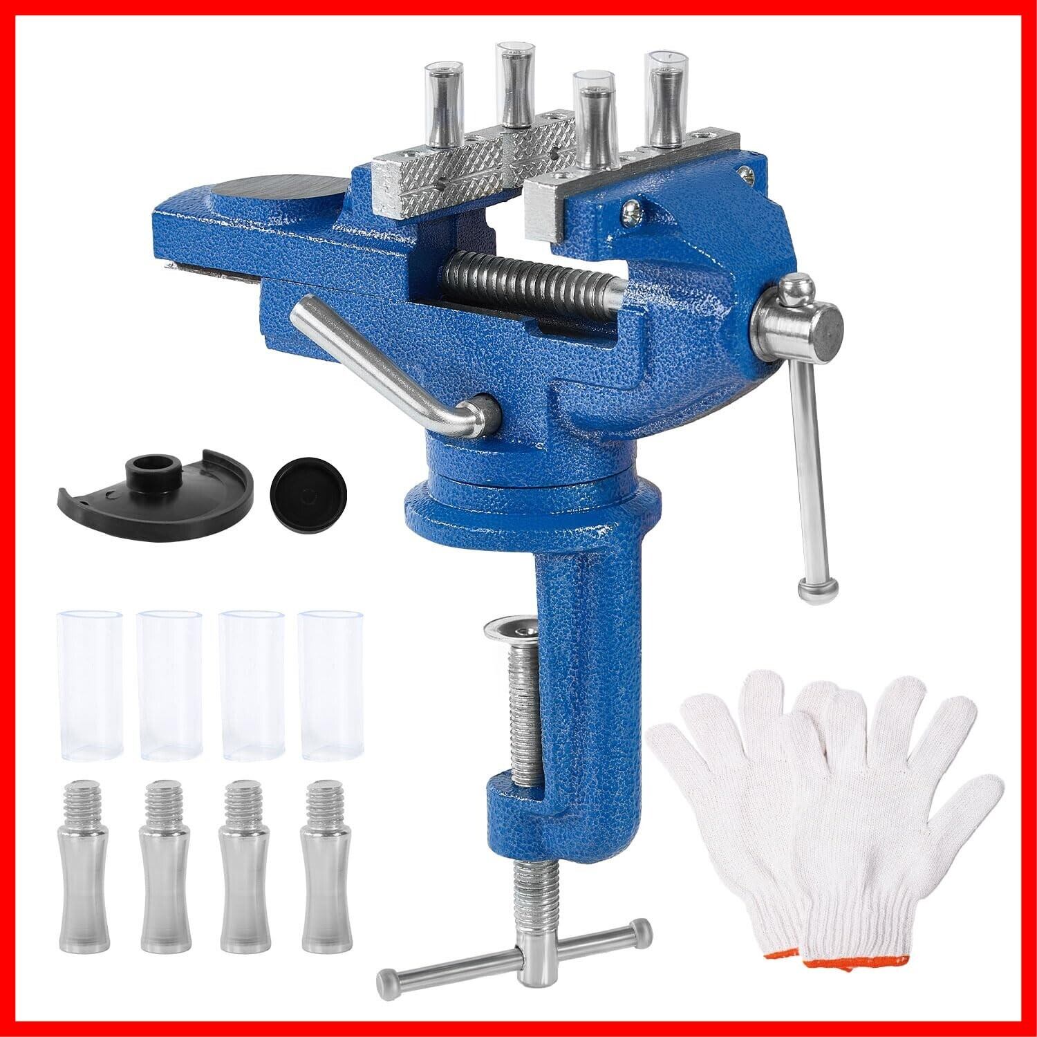 【サイズ詳細】本体重量1.8kg、360°回転盤。クランプの最大開口幅64mm クランプのグリップ力は300kg、【セット内容】青卓上万力*1、手袋x1、滑り止めマットx2、クランプポスト4本と滑り止めゴムカバー4枚付き