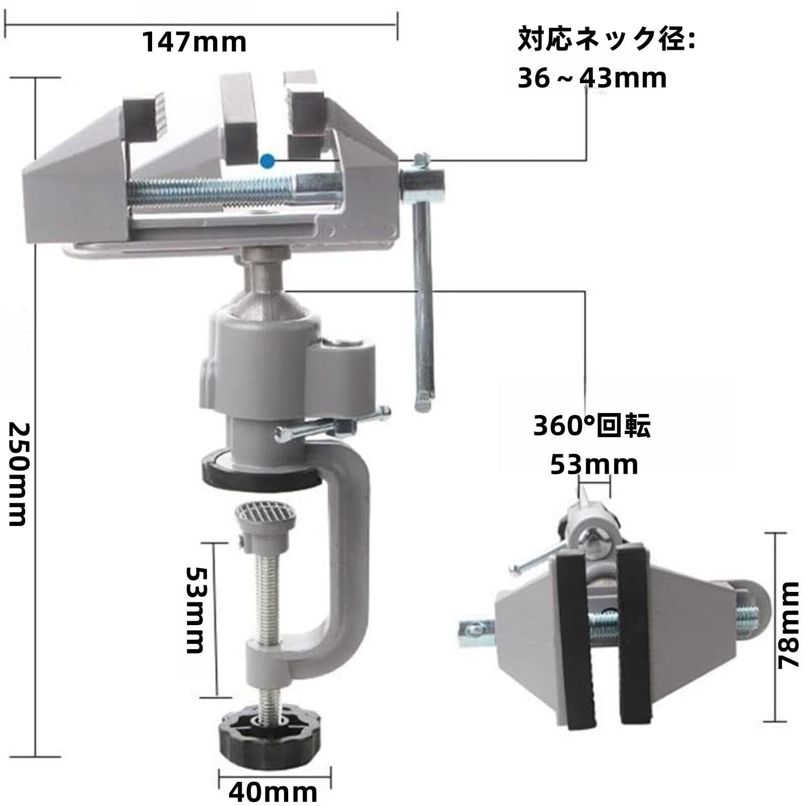 ヘッド部分が360°回転する取り付け横バイスです。素材を固定した後に作業しやすい角度に調節できて便利。