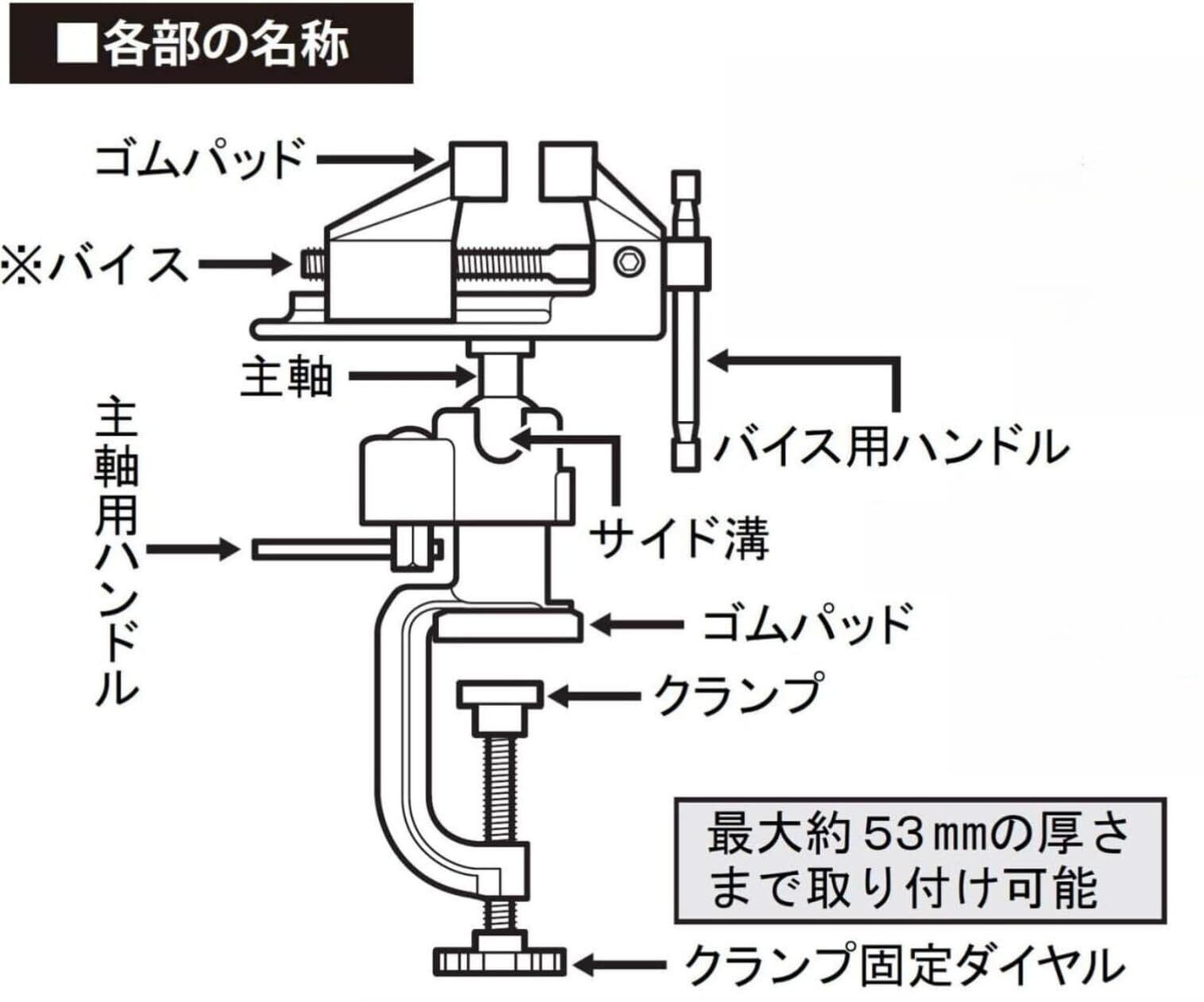 53mmまでの厚みの作業台に取り付けられるクランプも付いており、手軽に脱着できるのテーブルバイス。