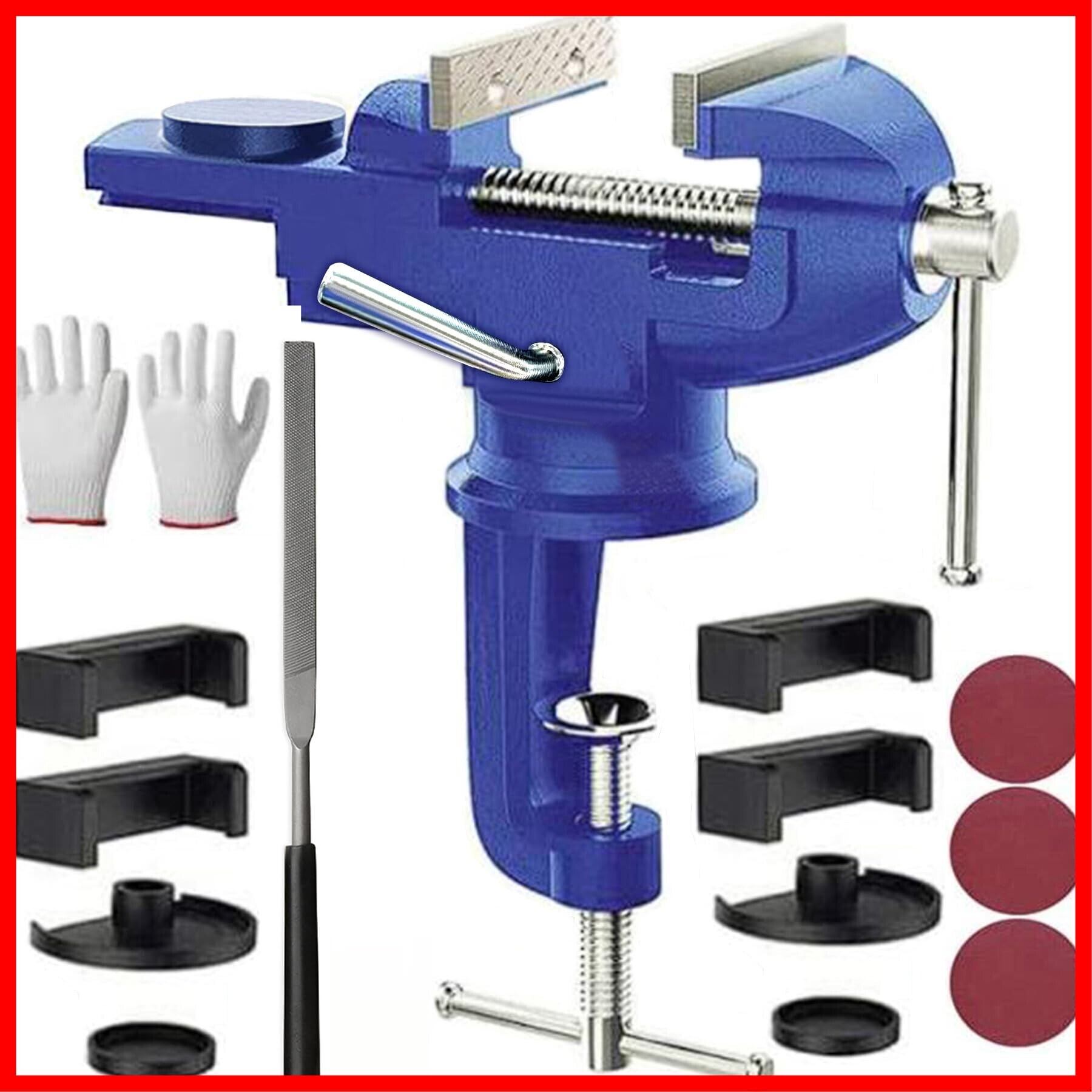 最大開口75mm 小型卓上万力青 360°回転盤付き ベンチバイス クランプ 携帯用作業台 木工 導管 穴あけ 金属加工