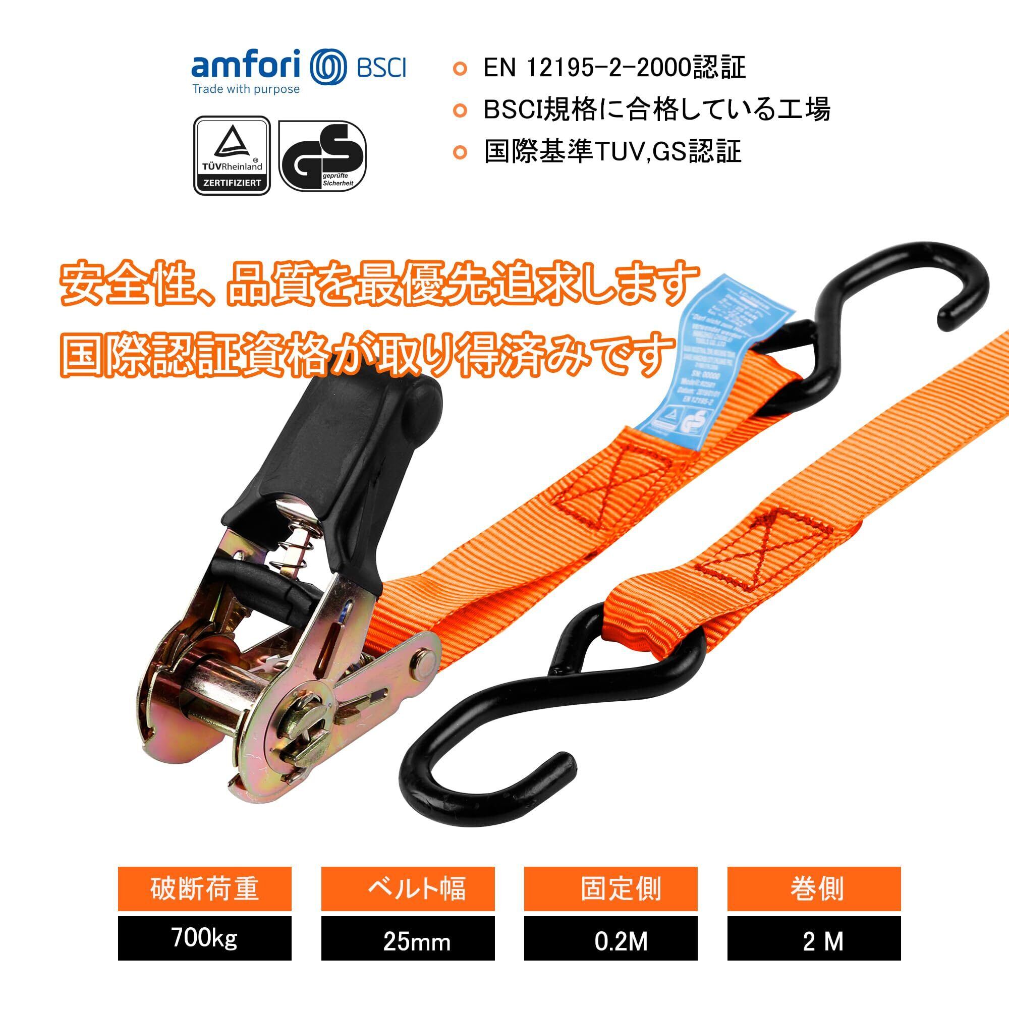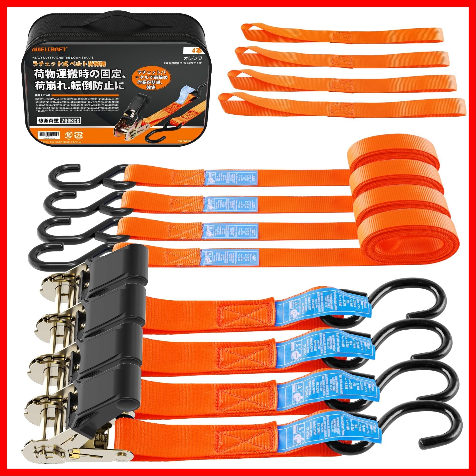 AWELCRAFT ラチェット式タイダウンベルト 破断荷重700kg GS認証取得済み 4本セット 長さ2M 荷締めベルト 幅25mm ラッシングベルト 荷締機 固定ベルト 固定バンド 締付固定 多用途 引越し 運搬用 オレンジ
