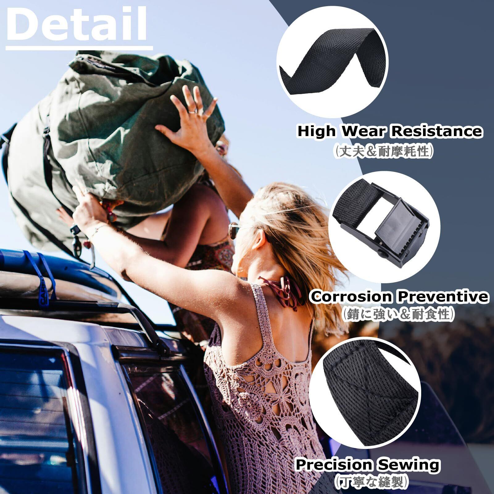 【製品材質】荷締めベルトはポリプロピレン生地を使っていて、耐摩耗性が優れています。メッキ加工した亜鉛合金のバックルは頑丈で耐久です