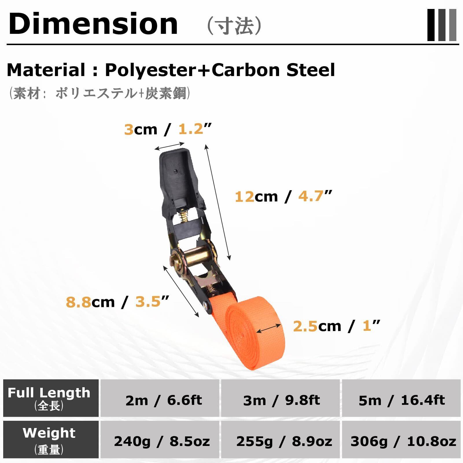 【仕様】タイダウンベルト幅25mm、全長 5m。カラー:オレンジ、ブラック、レッド。バックル種類:ラチェット式、端末の仕様:エンドレス