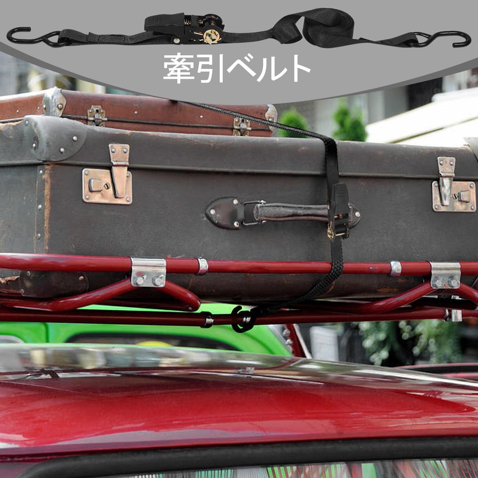 パッケージ内容:荷締めベルト x 2、黒、長さ5m、幅2.6cm。走行中に荷物が崩れるのを防ぐため、ルーフブラケットに重い荷物を固定するために使用します。
