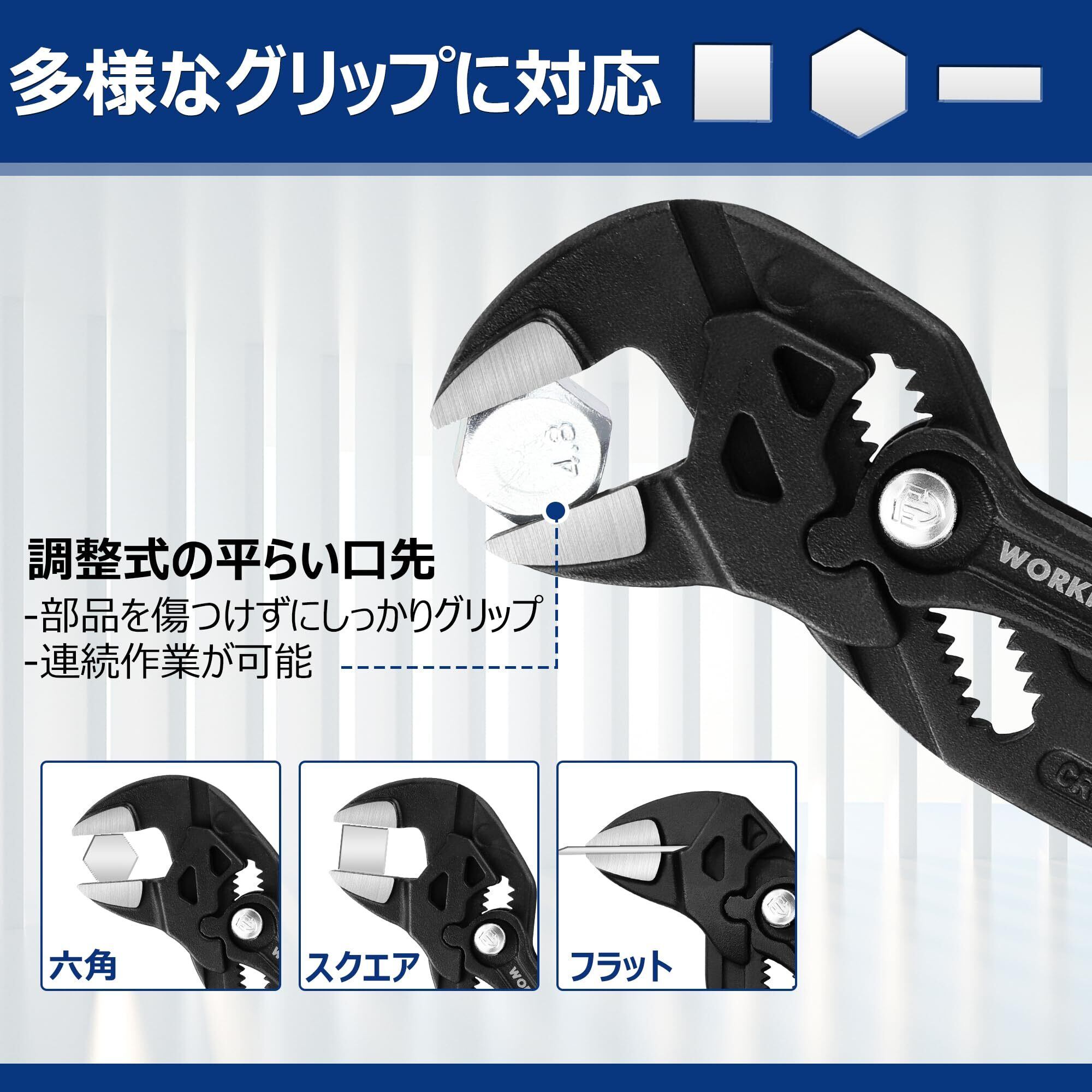 【多機能で用途が広い】多機能のジョーは、丸形、平らな形、四角形、六角形などのワークピースを把持できます。ナット、ボルト、パイプ、継手などを把持、引き抜き、締め付け、緩めるための最適なツールとなります。