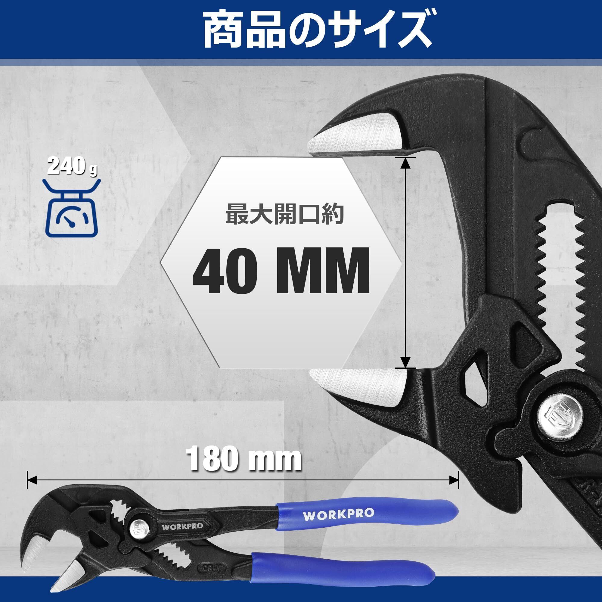 WORKPRO プライヤーレンチ モンキレンチ アジャスタブルレンチ 全長約180mm ペンチレンチ CR-V 建設用レンチプライヤー 最大口開幅 約40mm ブラック仕上げ ロック機構