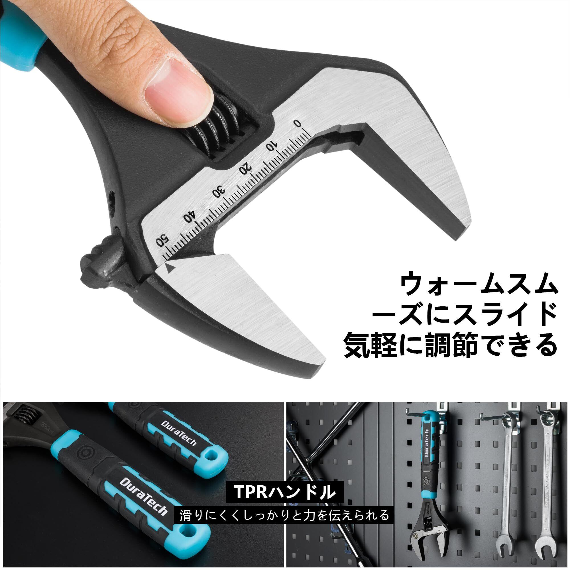 DURATECH モンキーレンチ ワイド アジャスタブルレンチ 多機能スパナ 250mm 最大開口50mm 調整可能 目盛付 ゴムマット付 CR-V 水道管 配管 自動車 自転車 オートバイ修理 機械修理 メンテナンス