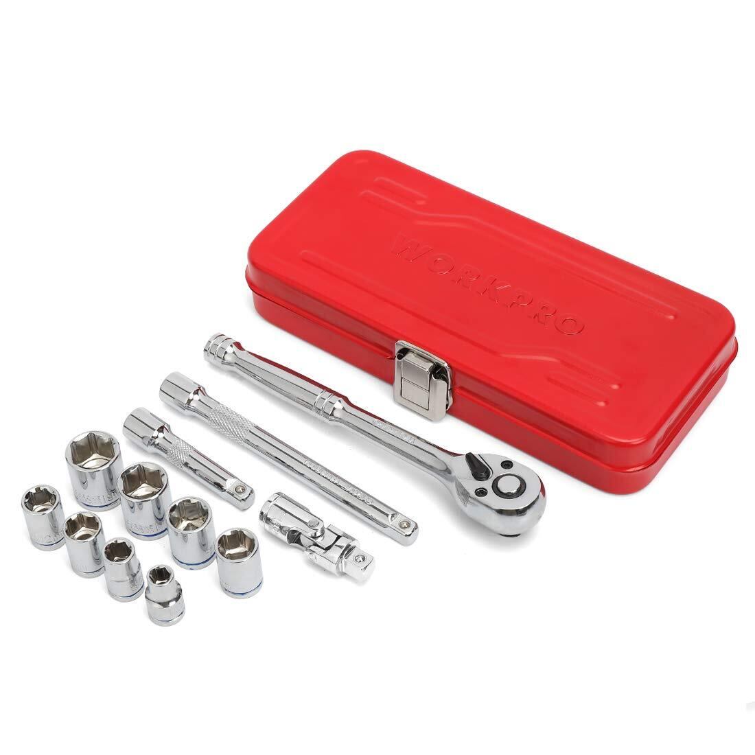 WORKPRO ソケットレンチセット ガレージツールセット ラチェットレンチ 差込角9.5mm(3/8インチ) クイックリリースラチェットハンドル 工具 道具 セット 12点組【鉄製ケース付属】