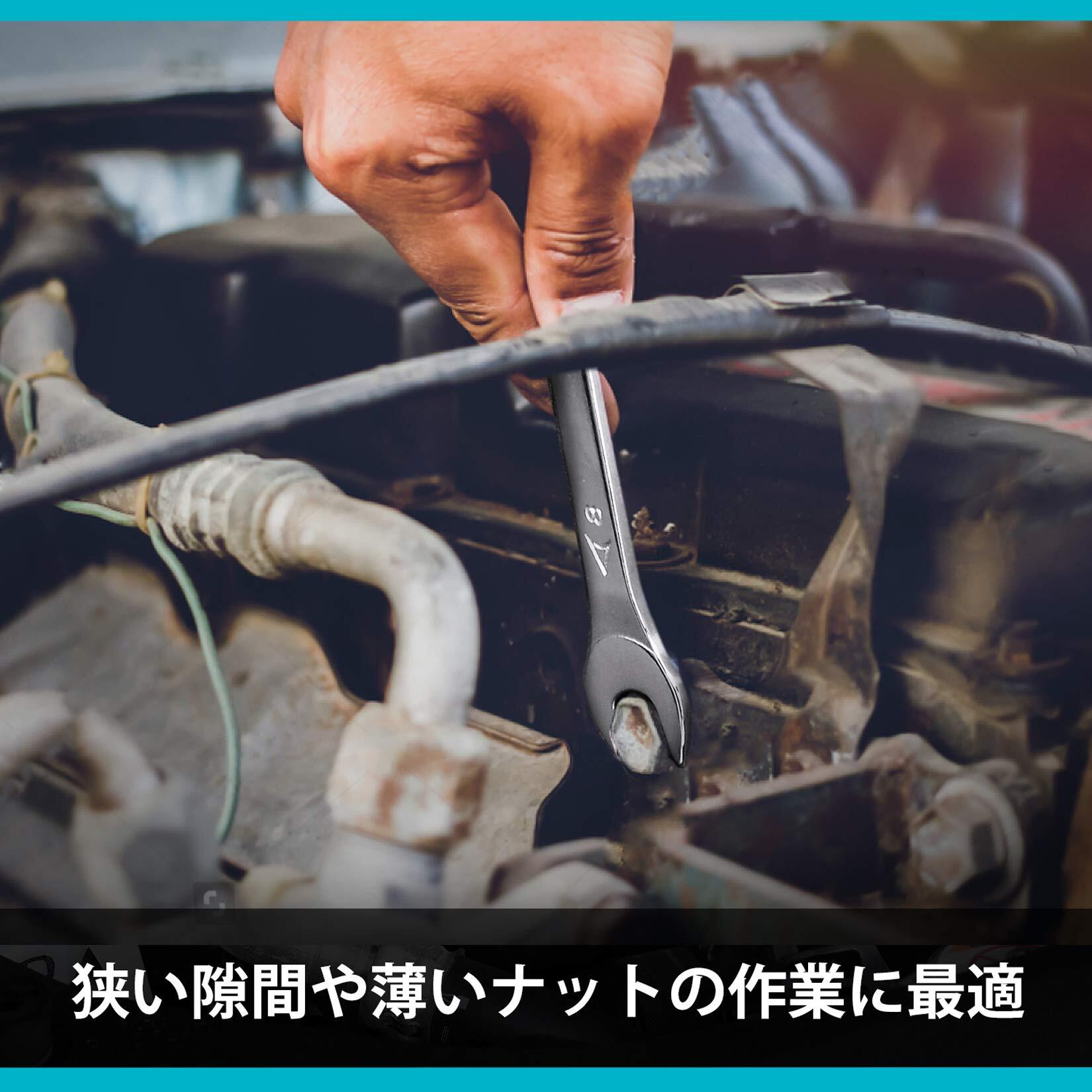 【使用勝手】1本2サイズで多くのネジ作業に対応できて、番手も刻印されて一見ですぐ分かります。厚み僅か3mmの薄口スパナなので、狭いスペースでのナットの締めつけや緩めに最適です。