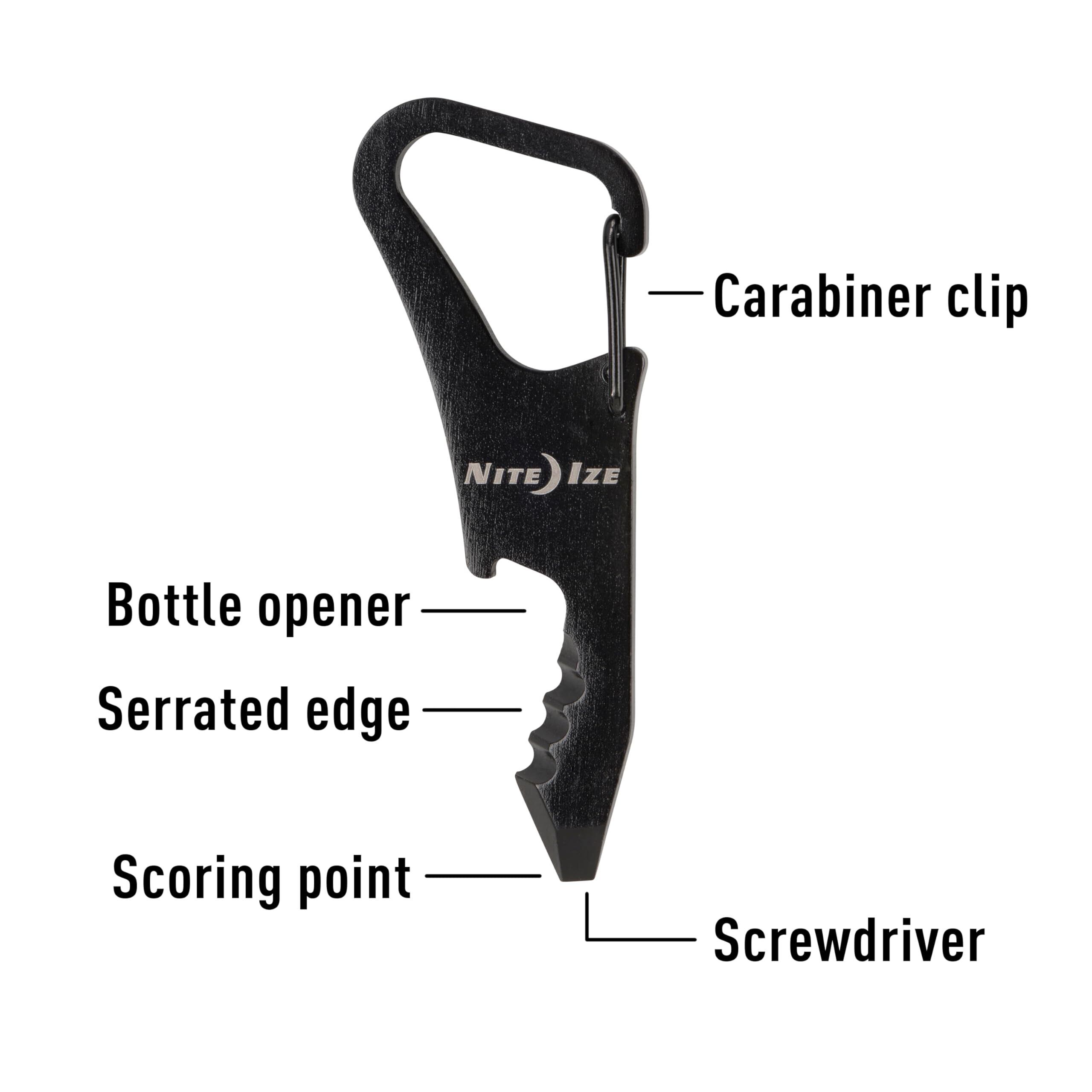 小指ほどの大きさに、「ボトルオープナー」・「マイナスドライバー」・「ボックスカッター」・「スコリングポイント(けがき)」・「カラビナクリップ」の5つの機能がひとつに集約。
