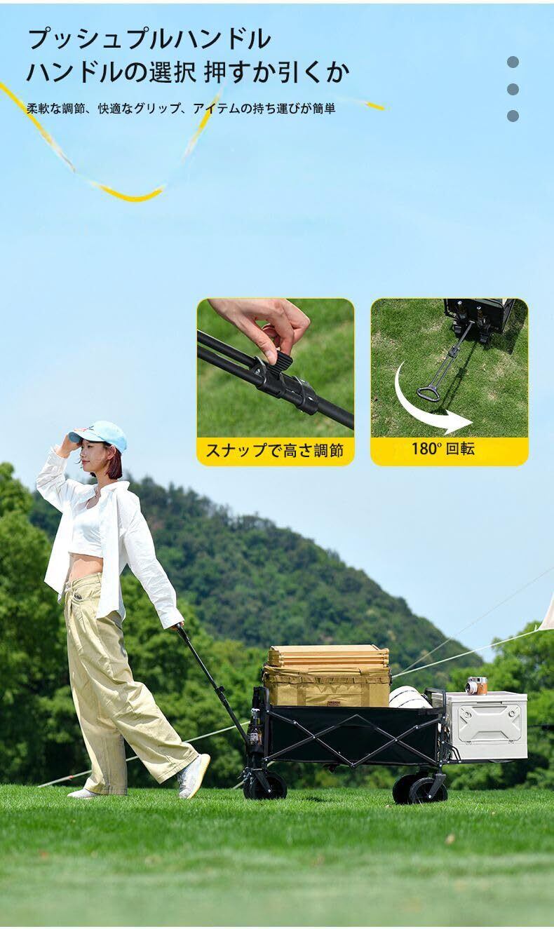 【あらゆる場面で大活躍】草むらや芝生の上だけでなく、河原や砂利道などの悪路でもスムーズに荷物を運ぶことができます。キャンプ用品の運搬にも大変便利で、重い荷物もラクラク運べます。さらに子供も乗せられるので、子供も大喜び。合宿でのキャンプ用品の運搬、運動会でのスポーツ用品の運搬、釣り用品の収納、BBQ、お花見など様々なシーンで大活躍します。