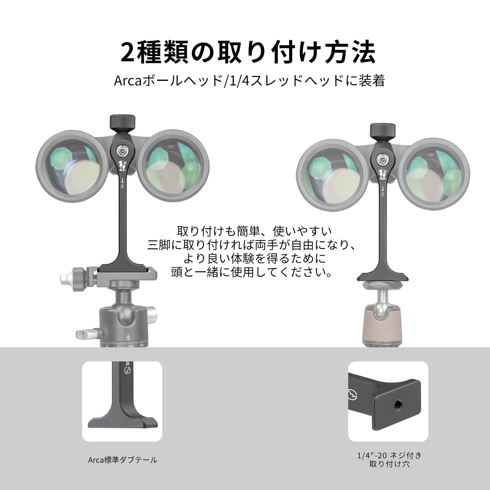 この双眼三脚アダプターは、取り外し可能な汎用取り付け金具を備えており、Arcaボールジョイントおよび1/4ねじヘッドと互換性があり、さまざまな双眼モデルに対応しています。