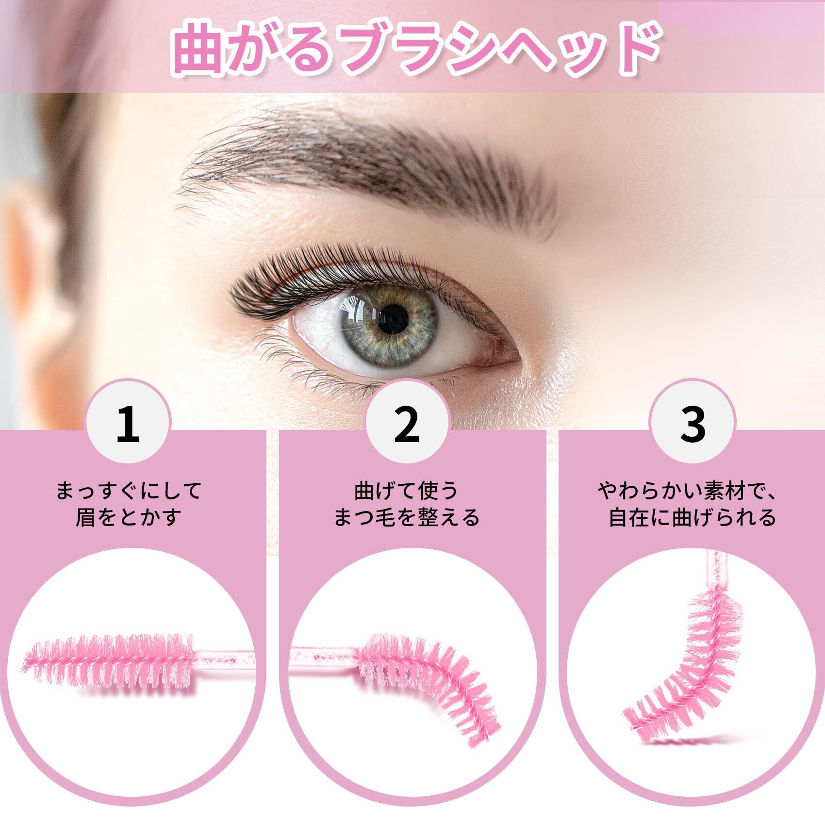 曲がるブラシヘッド:マツ毛ブラシの先端は自由に曲げられる柔軟構造。まつげや眉毛に合わせて角度を調整できるため、より正確で均一な仕上がりが可能です