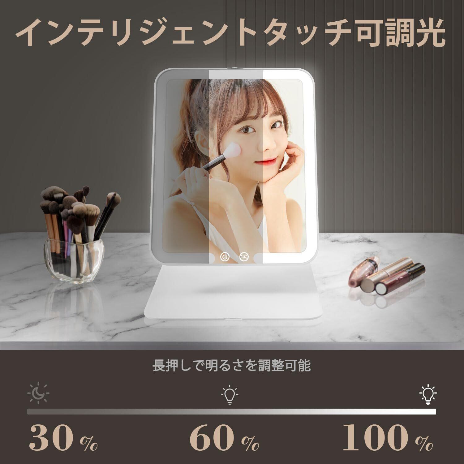 【三段階調色&無段階調光】ワンタッチでライトをオンオフし、電球色・白色光・自然光といった照明モードも簡単に切り替え可能です。朝や夜など暗い時間帯でも、気軽にメイクを楽しむことができます。無段階の色温度調整も可能で、タッチを続けることでお好みの明るさに自由に変更できます。