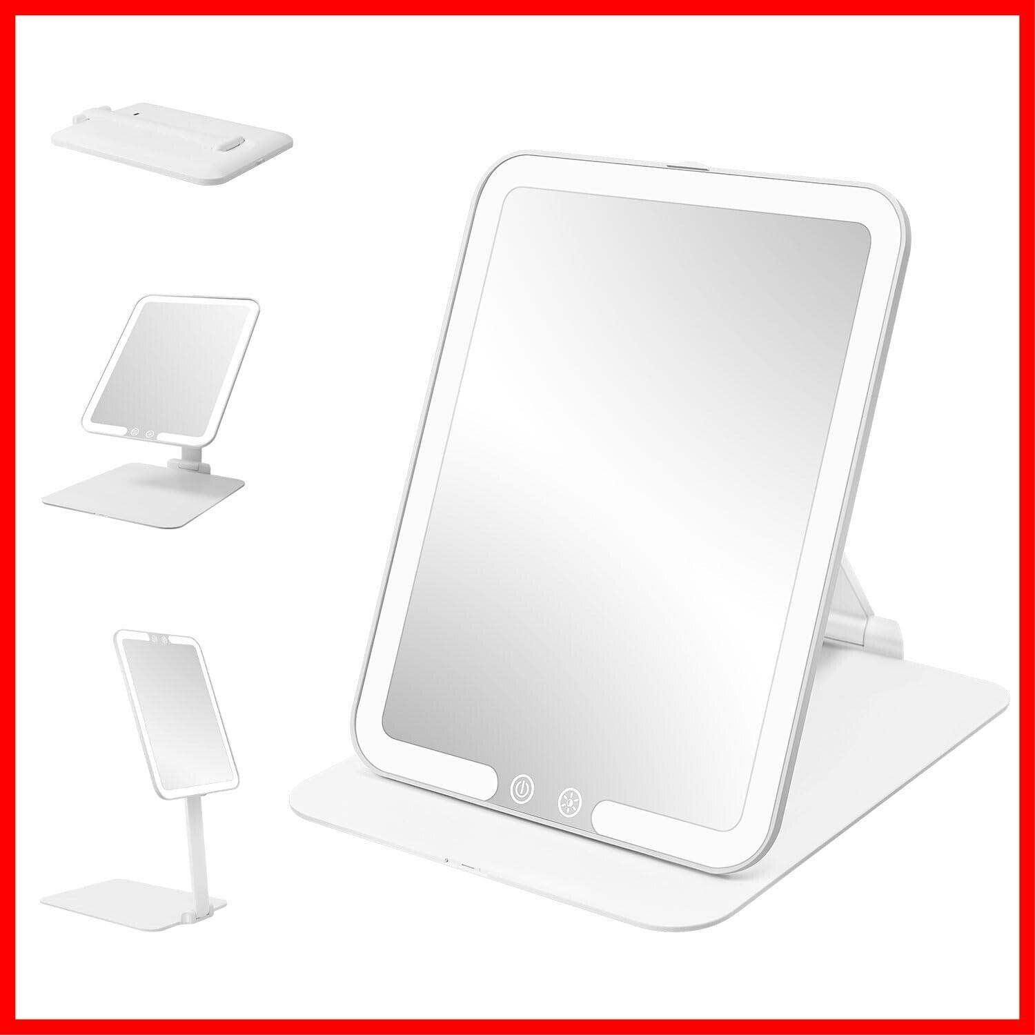 JEMISUN 鏡 折立鏡 卓上 ライト付き 女優ミラー 化粧鏡 折立ミラー 3光色 無段階調光 角度は自由に調整 USB充電式 収納便利 消し忘れ防止機能 LEDライト 日本語説明書付き (Medium)