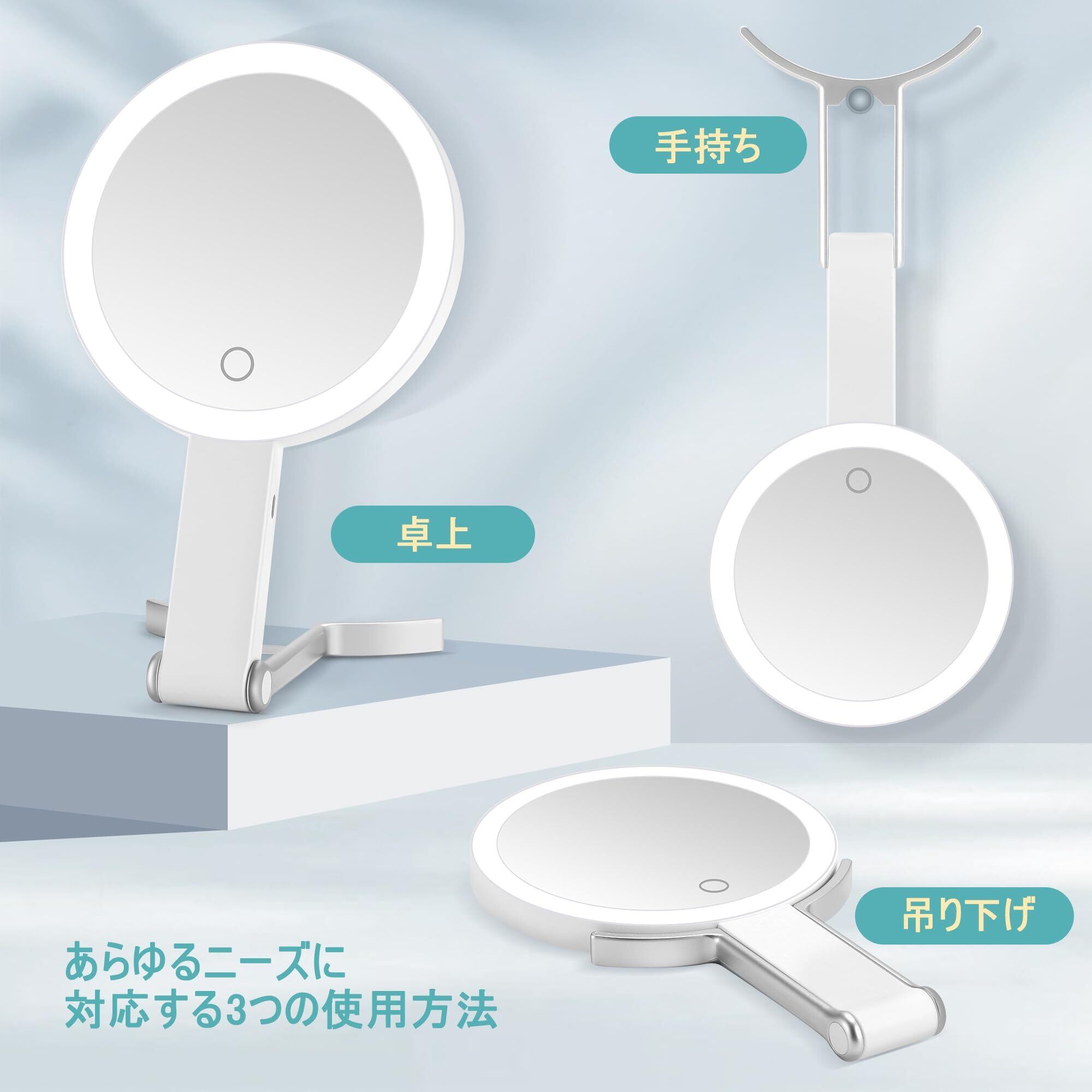 ライト付きトラベル 拡大鏡 両面20倍/1倍化粧鏡 充電式 明るさ調節可能 3色ライト 折りたたみ式 手持ち/吊り下げ/卓上 3つの使い方 白