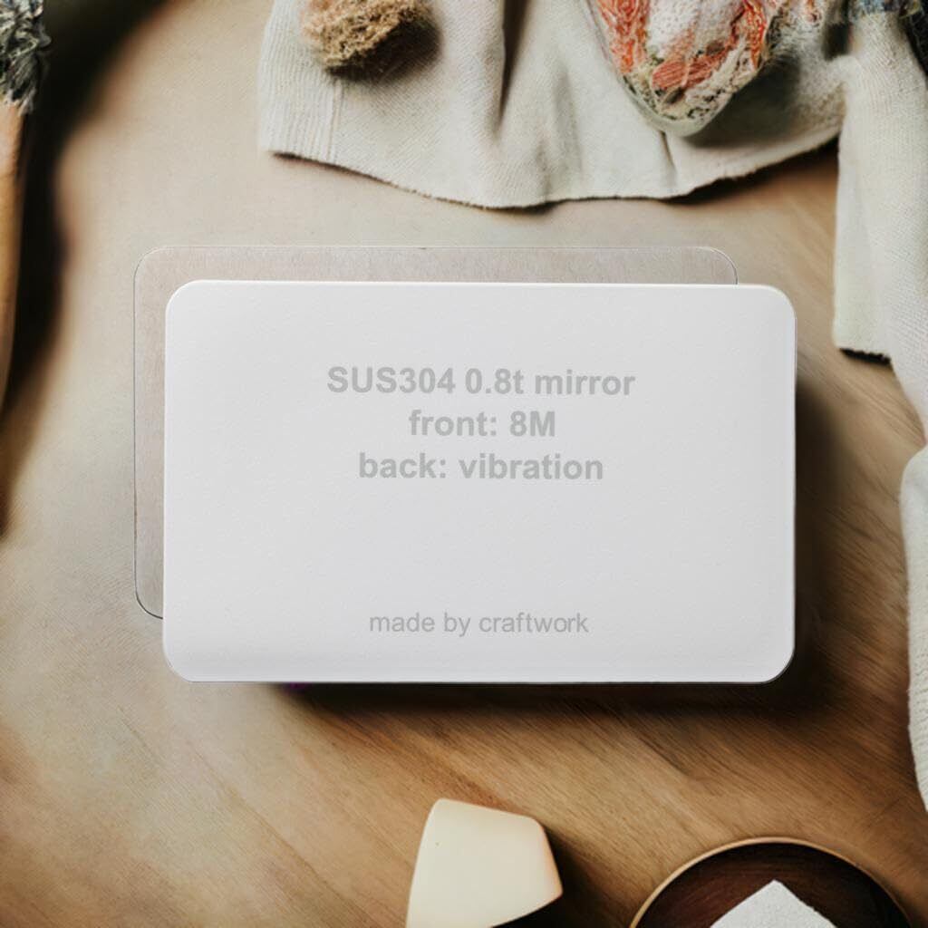 割れないステンレスミラーです。裏面はおしゃれなバイブレーション研磨になっています。ケースに入れたままカードケースに入る大きさになっています。