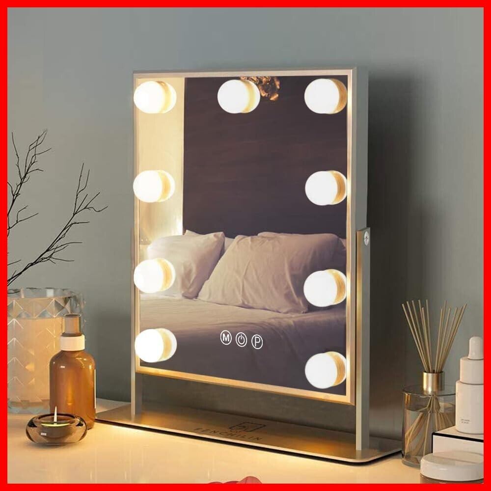 FENCHILIN 女優ミラー 卓上鏡 ハリウッドミラー 9個LED電球付き 10倍拡大鏡付き 三色照明モード 明るさ調節可能 360度回転 給電式(ホワイト)