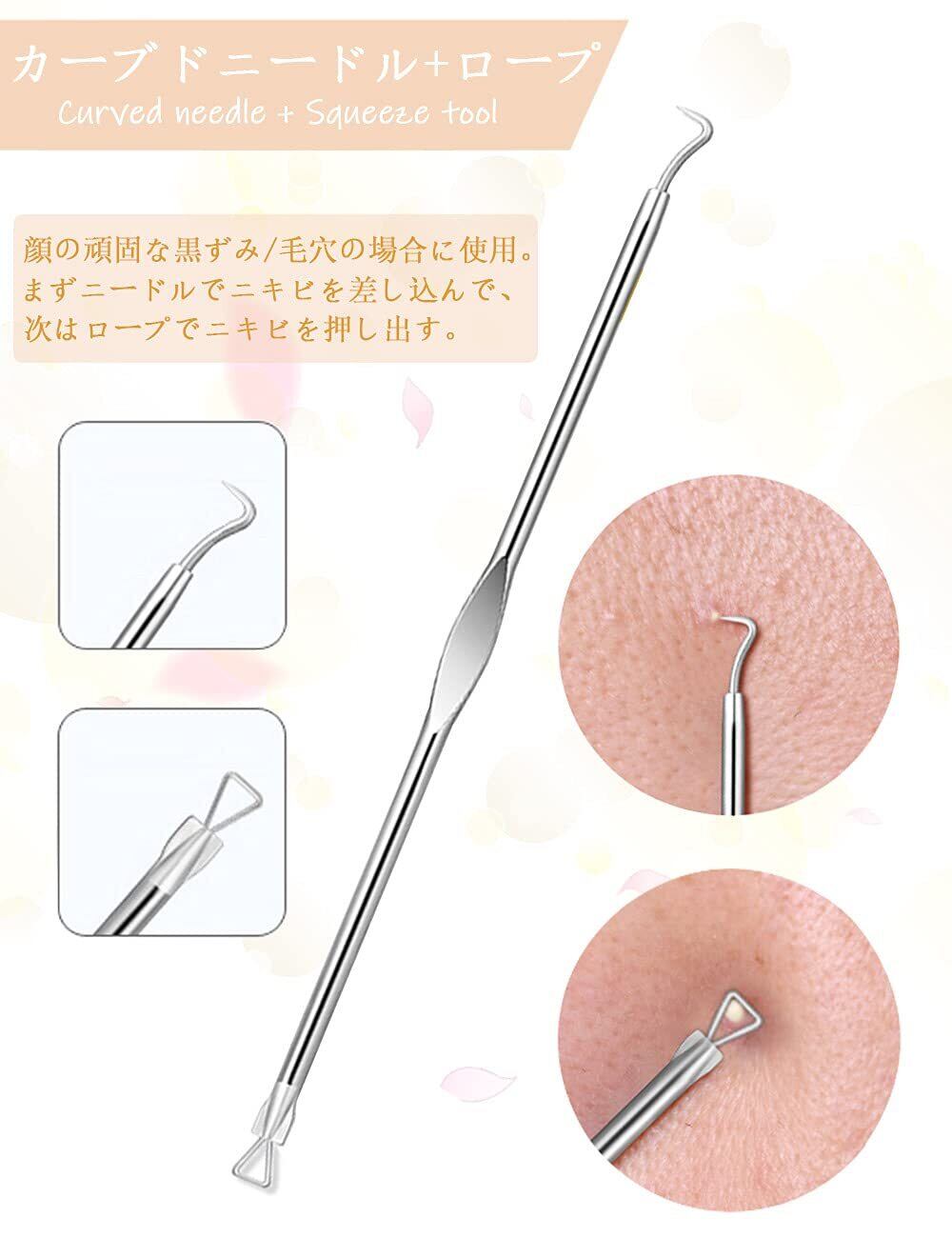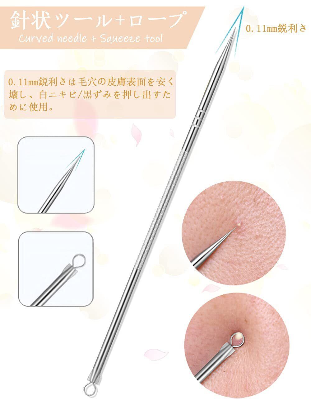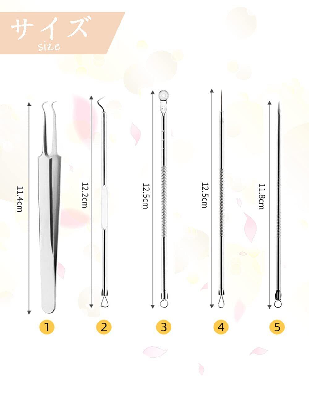 【5本セット】ニキビ取りツールは色々な用途に適しています。顔、鼻周りなどの角栓、黒ニキビ、白ニキビの除去に使用する専用スティックセットです。ニキビや黒ずみだけでなく、毛抜きとしても使用できます。