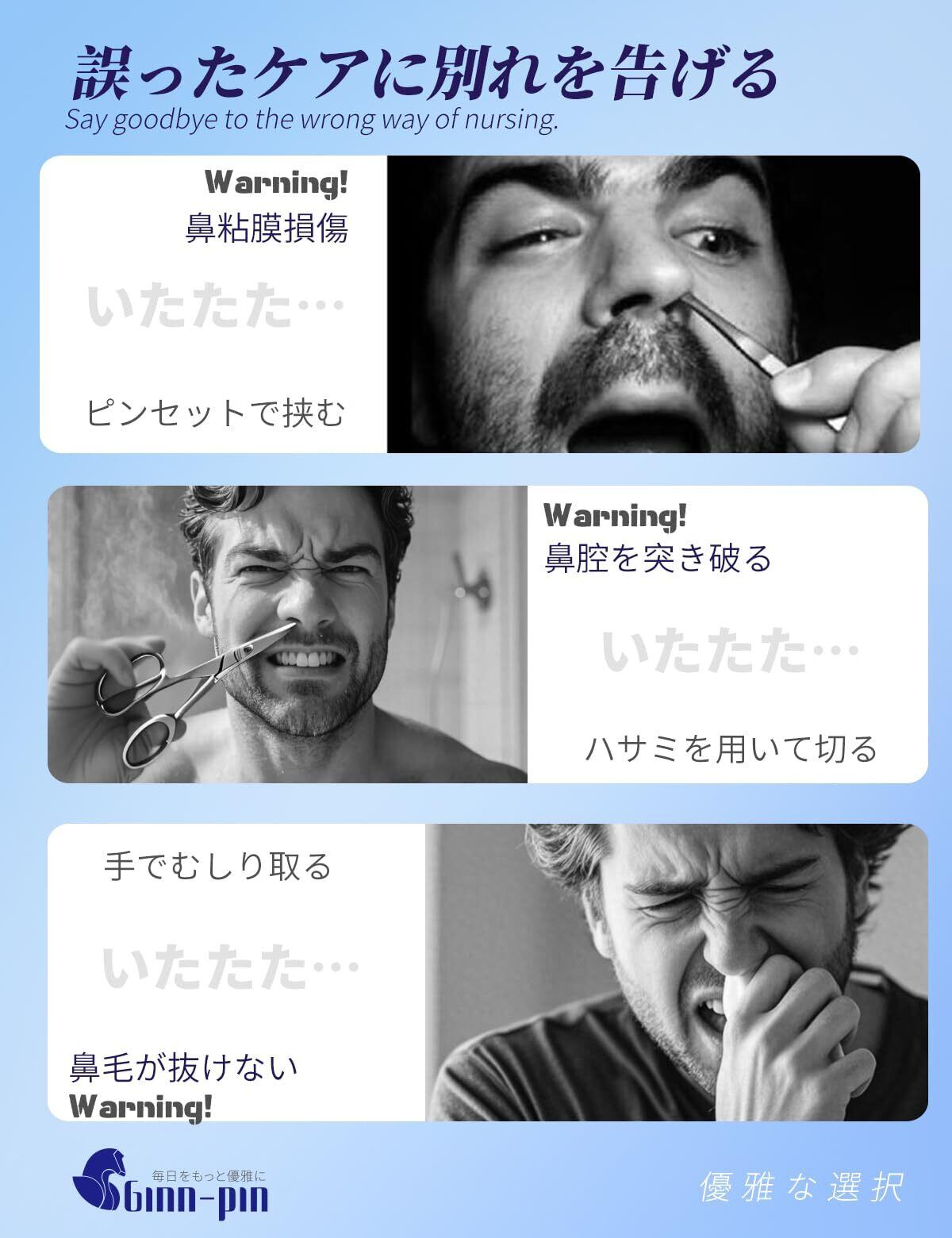 【適切な長さで健康を守る】 鼻毛が必要以上に切りすぎると、空気中の雑菌やウイルスが体に侵入しやすくなります。Ginn - Pin の高級鼻毛カッターは、独自の精密機構により、無駄に切りすぎることなく、鼻毛を最適な長さに整えることができます。健康を第一に考えた設計で、あなたの体の防御線をしっかりと守ります。