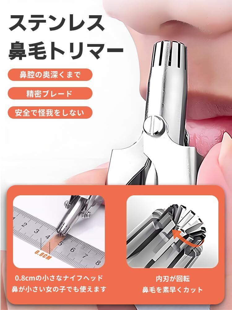 【効率高い&安全と快適】 鼻毛 カミソリ 手動鼻毛カッター 、3Dデザインのトリマーヘッドと回転するインナーリング刃を備え、鼻毛を引っ張らずに、どの方向の鼻毛も簡単に処理できる安全な仕様です。3Dデザインのトリマーは、人間工学に基づき、内蔵されたダブルブレードが鼻腔に密着し、鼻毛を素早くトリミングします。