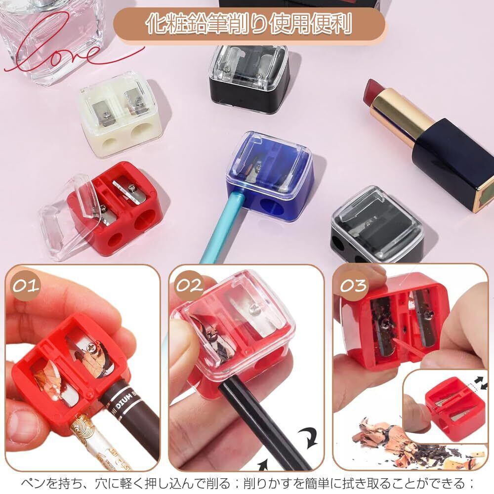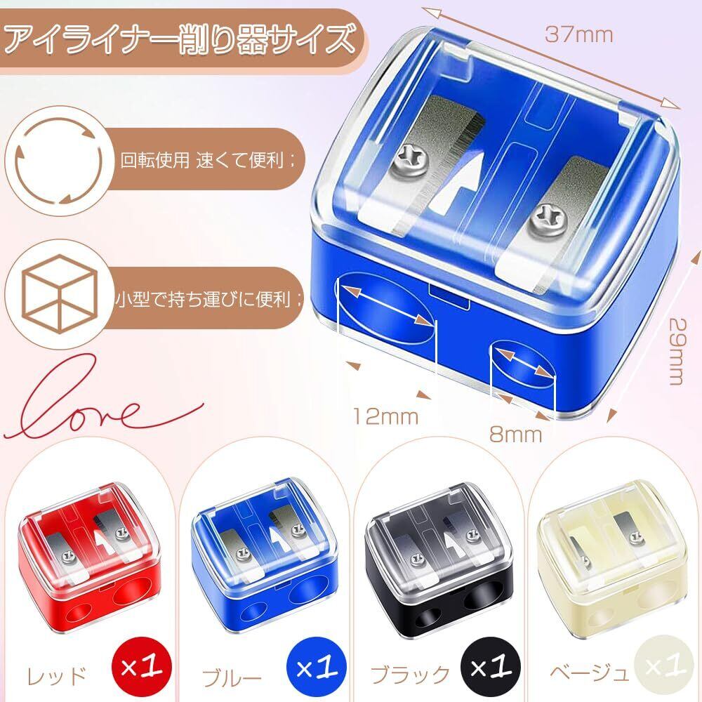 セット内容:アイライナー削り器 4点セット;可愛い4色:ブラック +レッド+ブルー+ベージュ4色各1本;二重穴デザイン: 大きな穴の直径は約0.47インチ/12mm、小さな穴の直径は約0.31インチ/8mmで、2つの異なるサイズのメイクアップペンシルを収納できます。