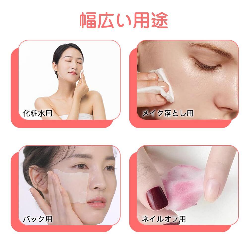 1. 清潔な手で1枚ずつ取り出してください。 2. メイク落としやスキンケアに使用する際は、適量の化粧水やクレンジングを少量取り、軽く押し当てて使用します。 3. 使用後は、ビニール袋や専用の容器に入れて、衛生的に保管してください。 4. 1回の使用で1枚使い切ってください。