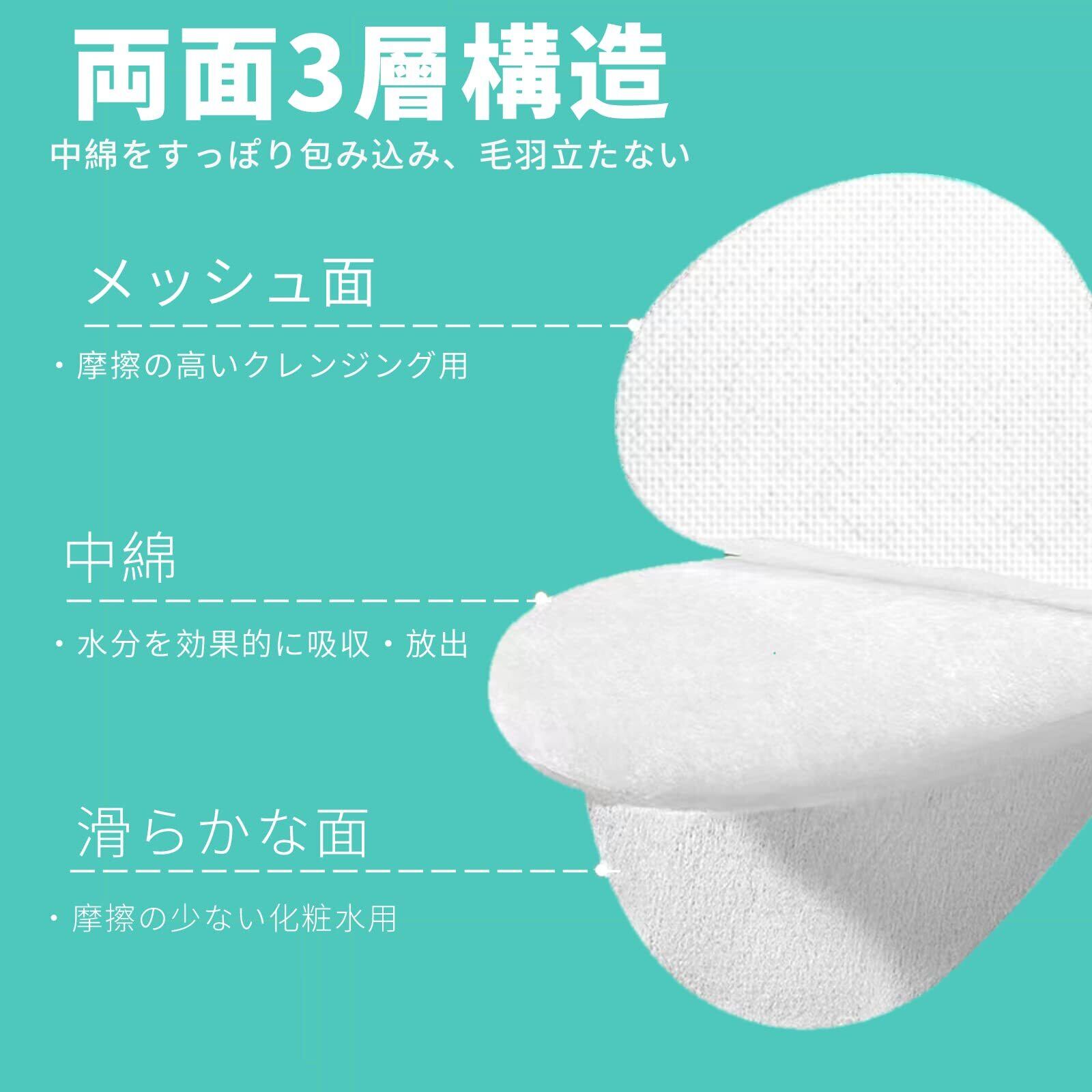 【毛羽立たない!特有の両面3層構造】ふき取り用コットンパフは、摩擦の少ない化粧水用滑らかな面と、摩擦の高いクレンジングに適したメッシュ面の2つの異なる面をあります。この両面が中綿をすっぽり包み込み、水分を効果的に吸収・放出し、肌への繊維残りや綿パフの型崩れを予防します。