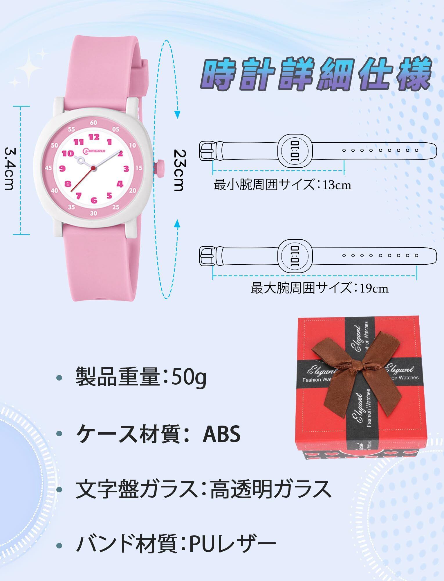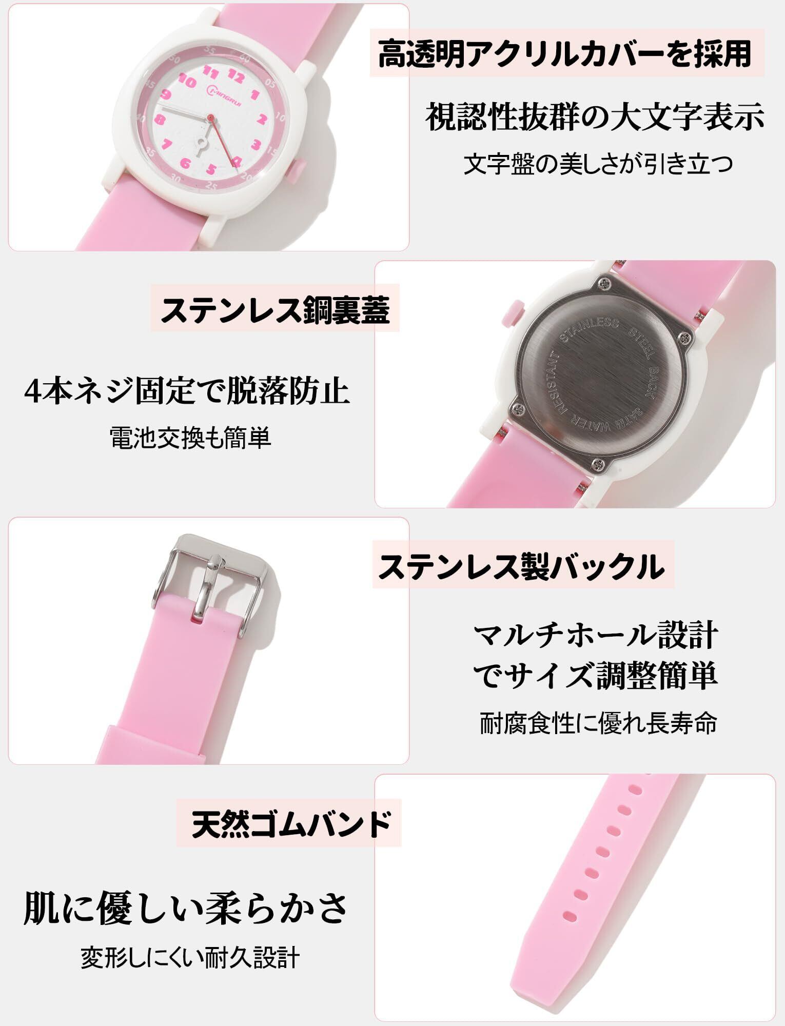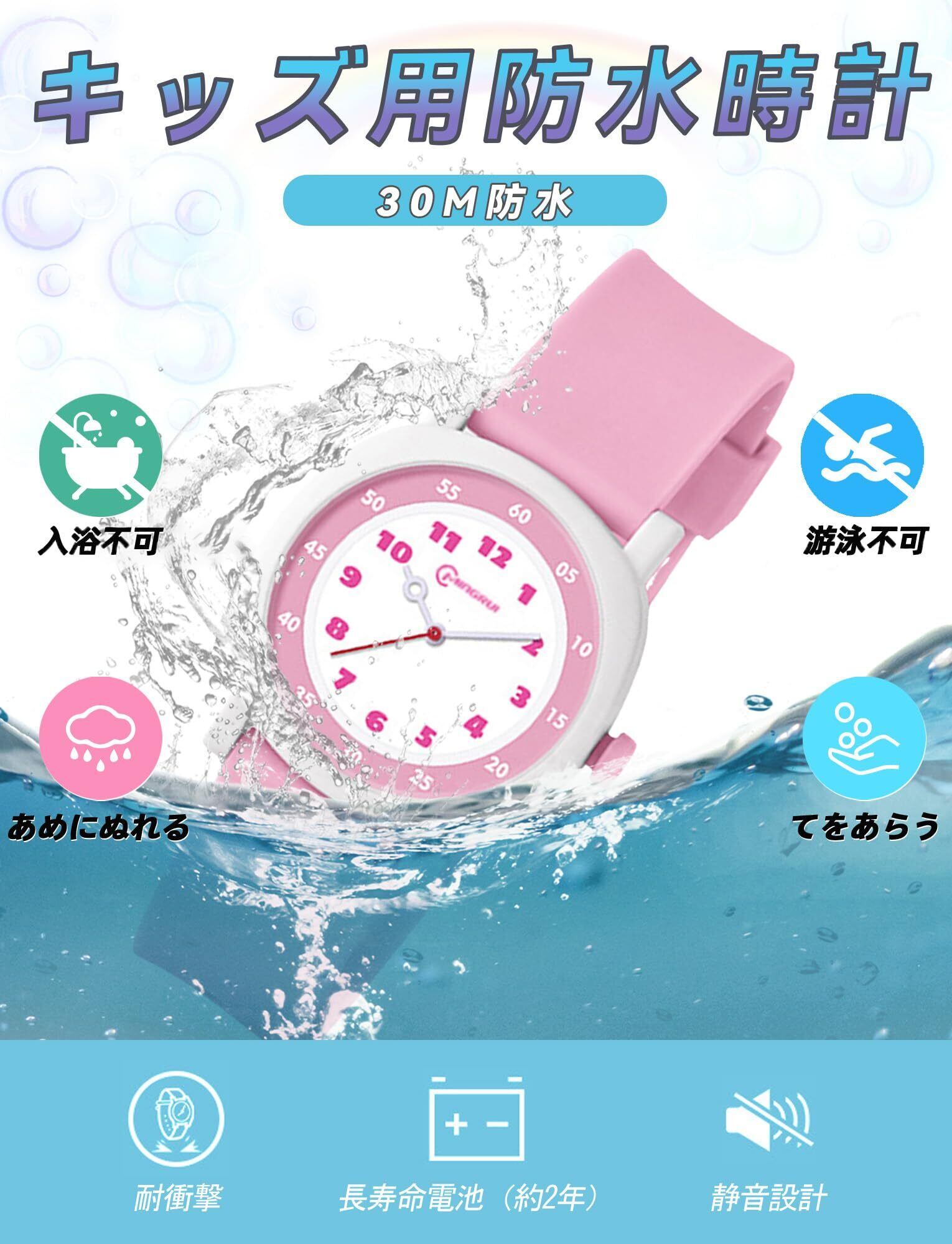 防水機能を備えており、日常の使用に適しています。キッズ腕時計として、雨の日や水遊びの際にも使用可能です。水に濡れても大丈夫なため、活発な子供にぴったりです。