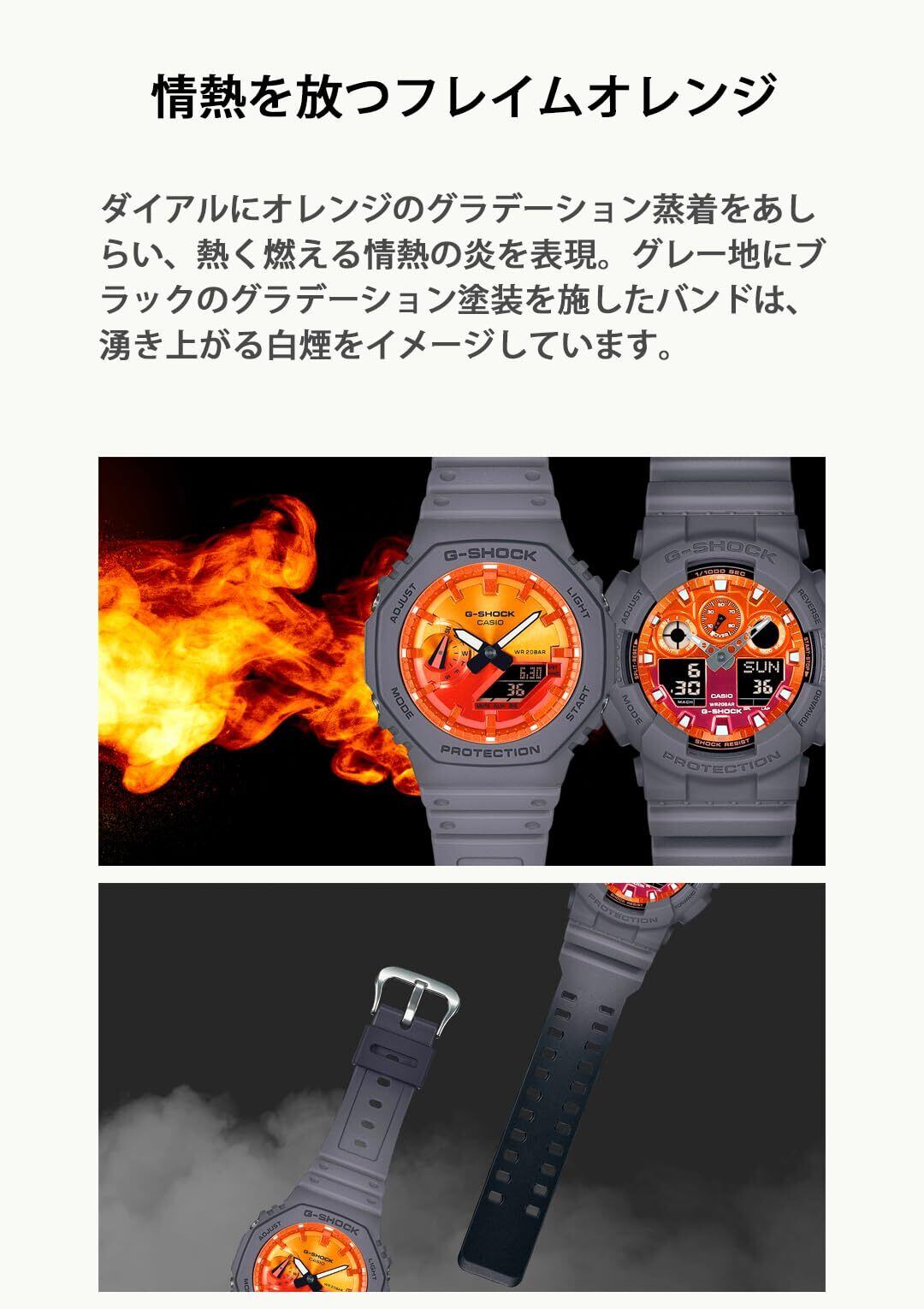 1983年の発売以来、飽くなき強さを求めて進化を続けるタフネスウオッチG-SHOCKから、G-SHOCKのブランドアイデンティティである挑戦をテーマに、胸の内で燃える情熱の炎をイメージした、Flame insideシリーズです。ベースモデルには、オクタゴンケースのGA-2100とビッグケースのGA-100を採用しています。ブラックボディに白煙をイメージしたグレーグラデーション塗装を施し、高い温度の炎をイメージしたクールなブルーのグラデーション蒸着文字板のGA-2100FL-1A/GA-100FL-1Aと、グレーボディに黒煙をイメージしたブラックグラデーション塗装を施し、低い温度の炎をイメージしたエネルギッシュなオレンジのグラデーション蒸着文字板のGA-2100FL-8A/GA-100FL-8Aをラインアップ。鮮やかなグラデーションカラーで情熱の炎を表現しました。蒸着処理を施したダイアルは、クールなブルーとエネルギッシュなオレンジの2色。バンドはスモークをイメージしたブラックとグレーでまとめ、蒸着色を際立たせています。