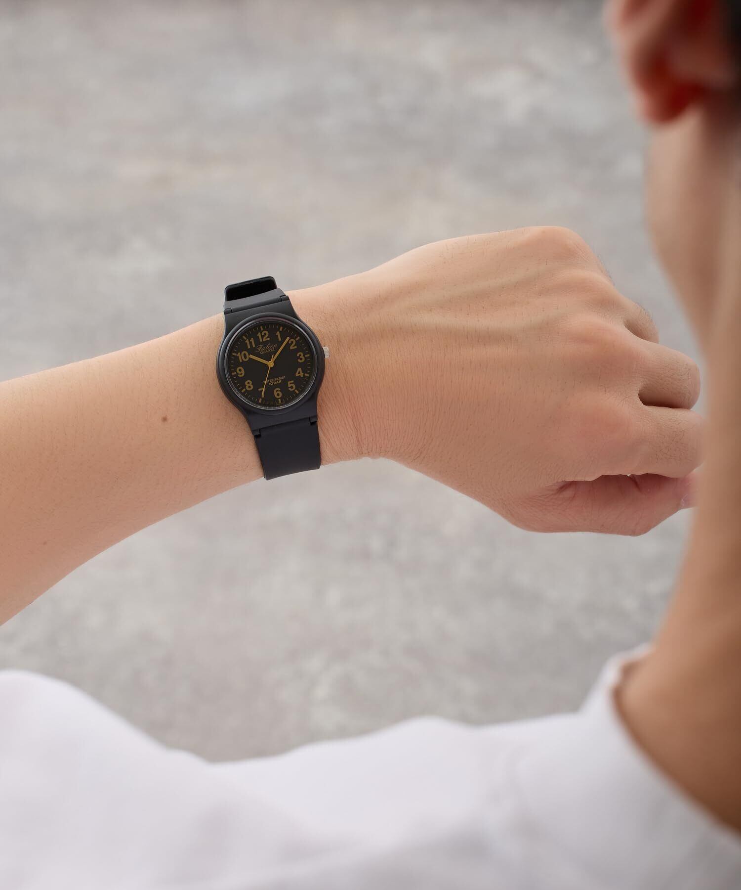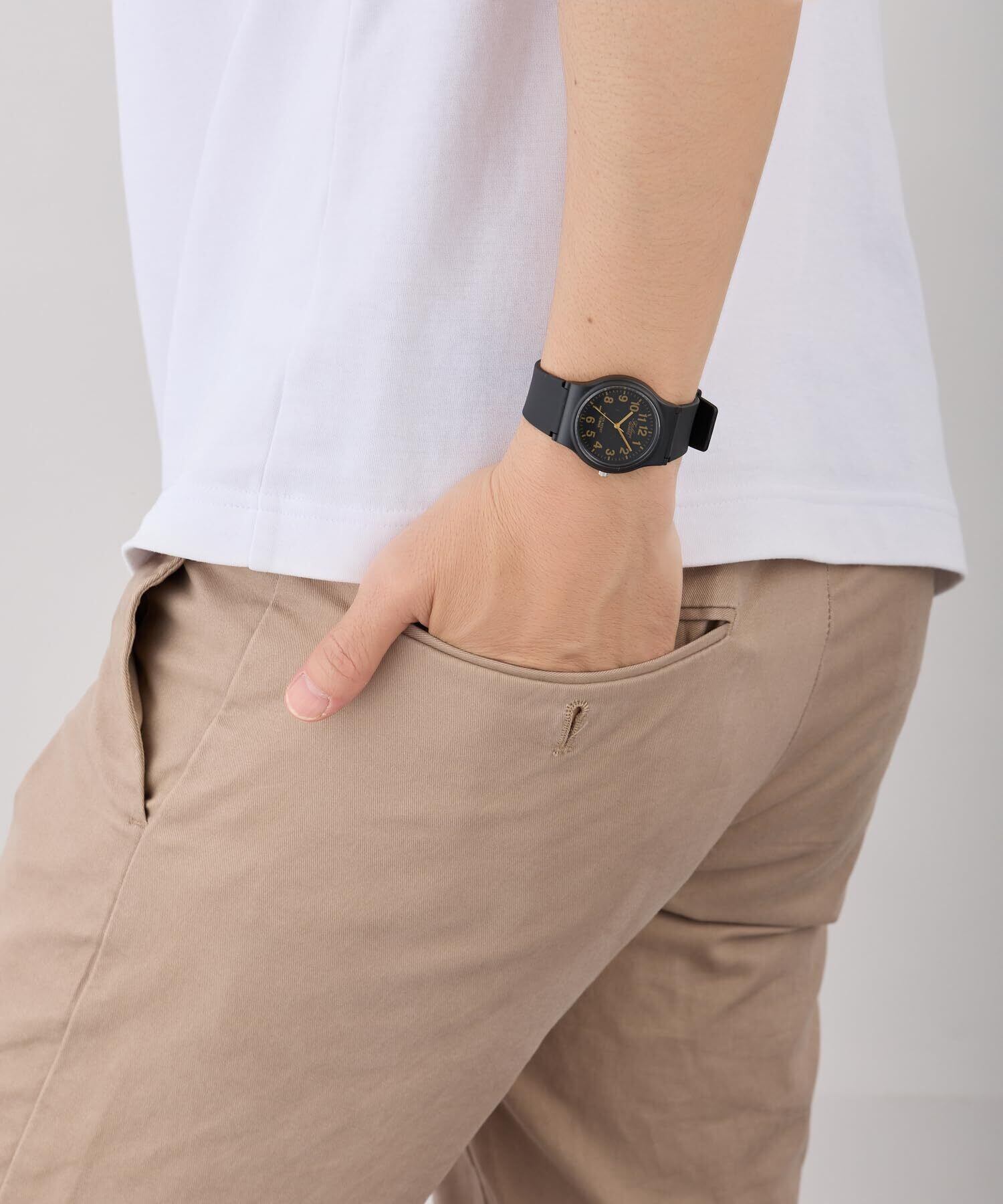 シンプルで見やすい文字板と10気圧の防水性を備えた、普段使いに最適なスタンダードな腕時計。ベルトは汚れに強く、耐久性に優れたポリウレタンを使用。ケースや風防には、樹脂やアクリルを使い軽くて丈夫な仕上がりになっています。34ミリと少し小さめなサイズなので、女性やお子様用としても最適です。