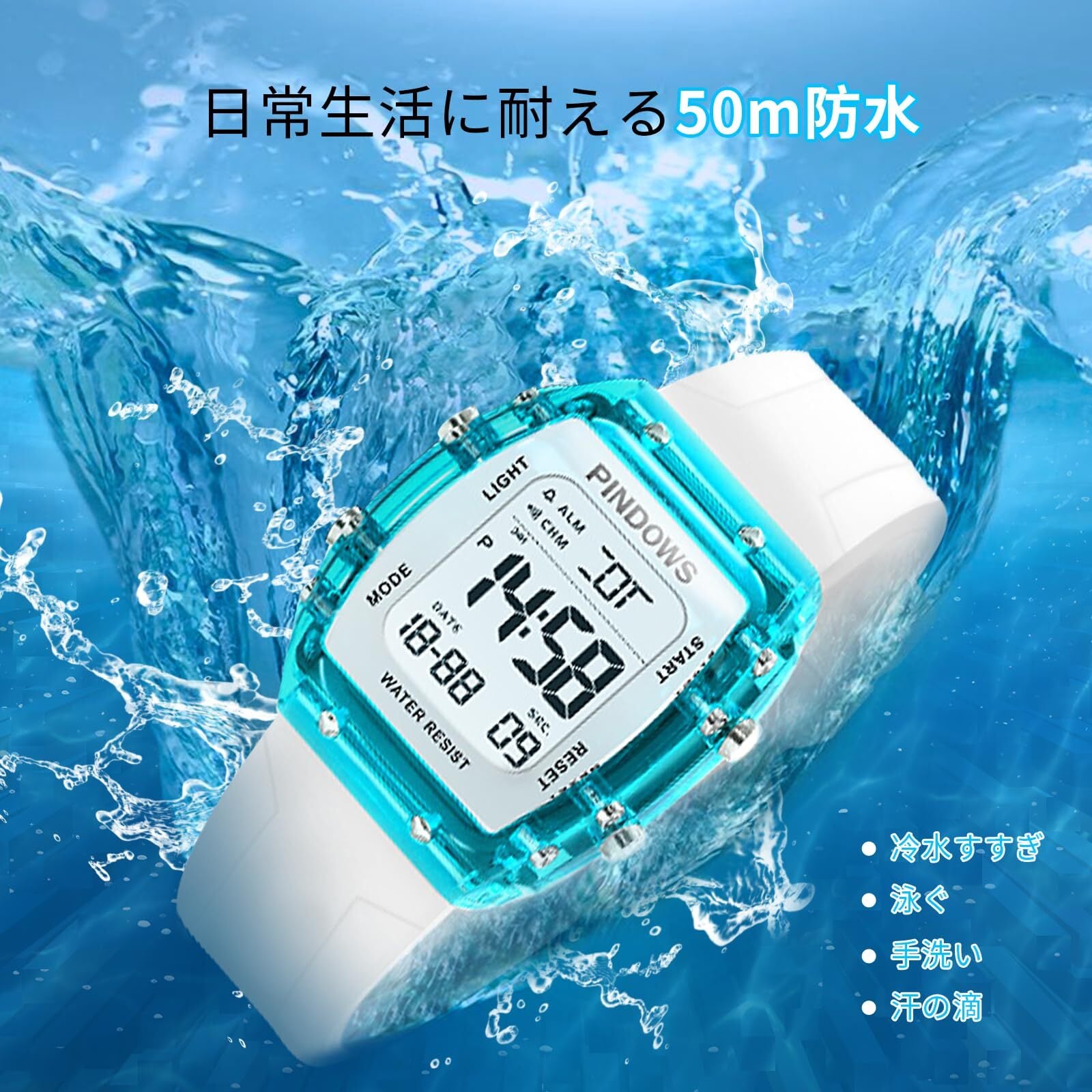 PINDOWS女性用デジタルスポーツウォッチ、クリアな透明ケース、明るいLEDライト、5ATM防水、ストップウォッチアラームデュアルタイム表示、アクティブな女性やティーン向けの 腕時計