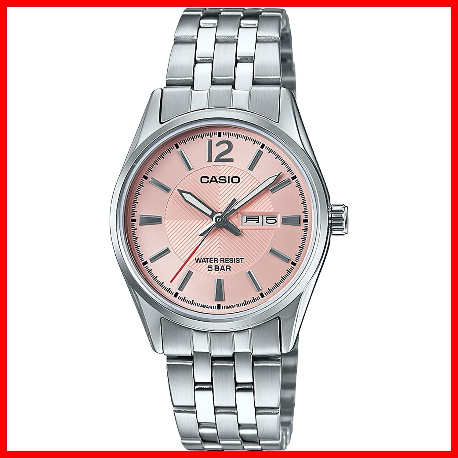 シンプルな3針のアナログウオッチです。3時位置には日付と曜日表示を備えています。