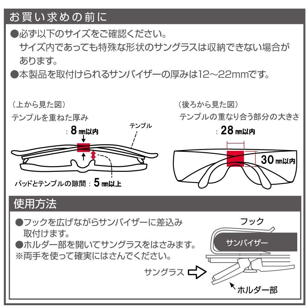 ●サングラスを2本収納できるサンバイザー取付式のホルダーです。 ●サングラスの脱着が簡単なスプリング開閉です。 ●360°回転するのでお好きな向きに固定できます。 ●クールなマットブラックカラーで車内を引き締めます。