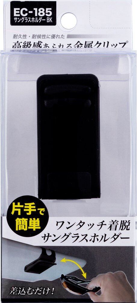 EC-185 サングラスホルダー BK 片手で簡単に着脱できるサングラスホルダー耐久性・耐候性に優れた高級感あふれる金属クリップホルダー部は、サングラスを傷つけないラバー製 オープンプライス■製品サイズ:H38 x W74 x D36 ■パッケージ:H180 x W80 x D45 80g■小箱サイズ:H200 x W335 x D245 20個入■外箱サイズ:H425 x W505 x D350 80個入■JAN:4974267131851でご購入はこちら