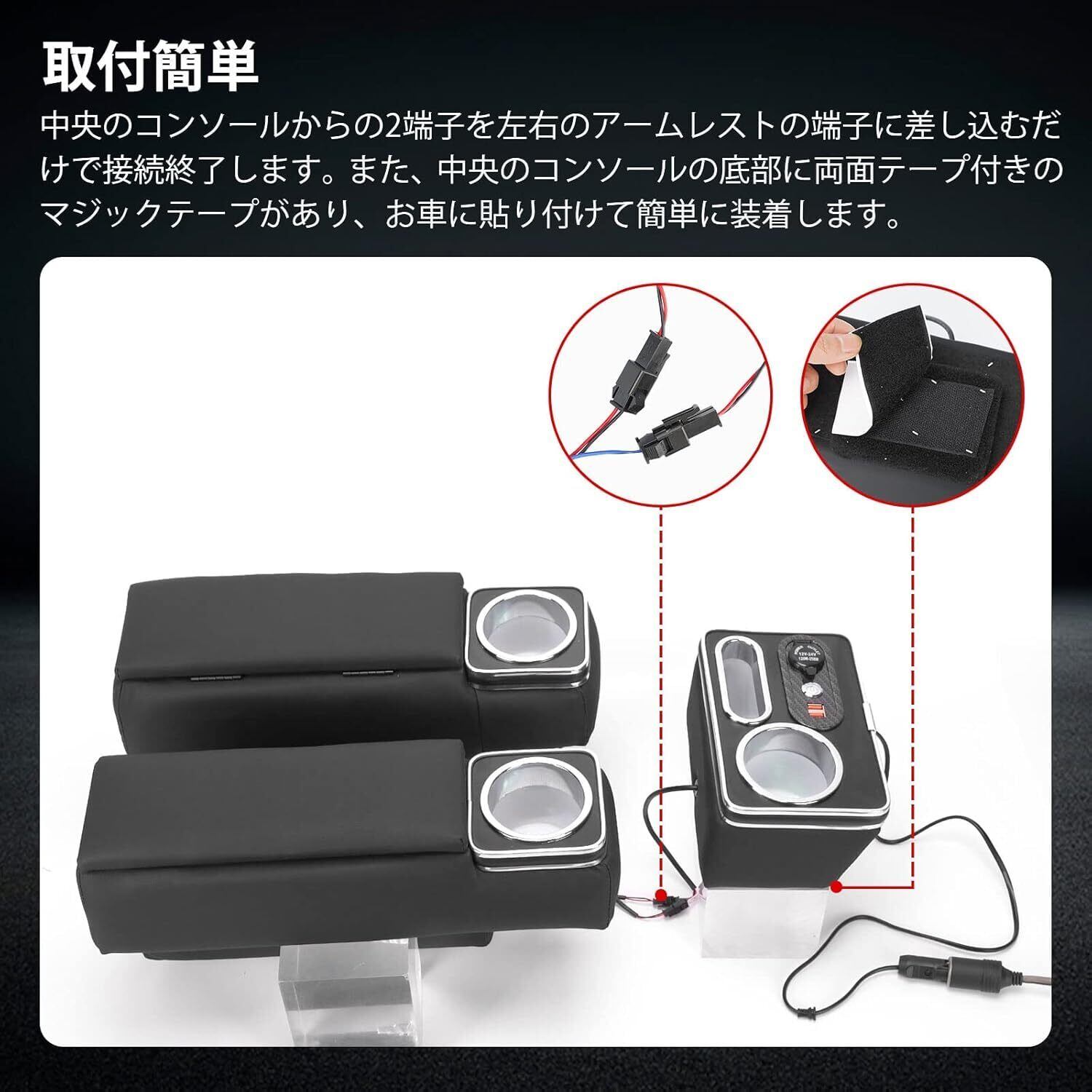 【多機能3点セット:LEDライト・USB・ドリンクホルダー】セット内容はアームレスト2個+コンソールボックス1個。LEDライト付きで、夜間走行時や車中泊でも活躍。シガーソケットから給電し、スイッチで簡単点灯。USBポート×2、シガー×1、スマホホルダー、ドリンクホルダー×3など多機能搭載で、長時間移動・キャンピングカー仕様・DIY車内改造にもおすすめです。