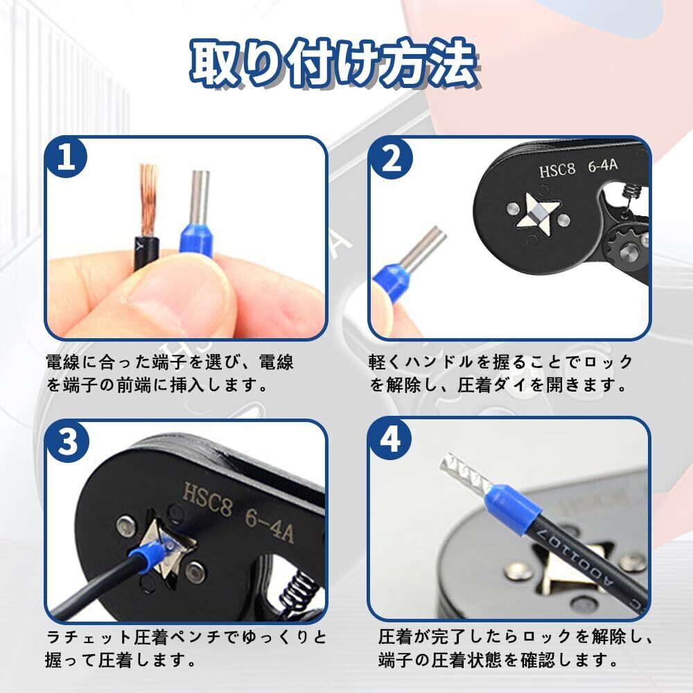 多機能圧着工具:本セットには高品質の圧着工具が含まれており、四角形の圧着とギザギザの圧着デザインにより、四方向から同時に圧力を加えて電線をしっかりと接続できます。0.25-10mm²の電線に対応しており、さまざまな電気工事や配線作業に適しています。