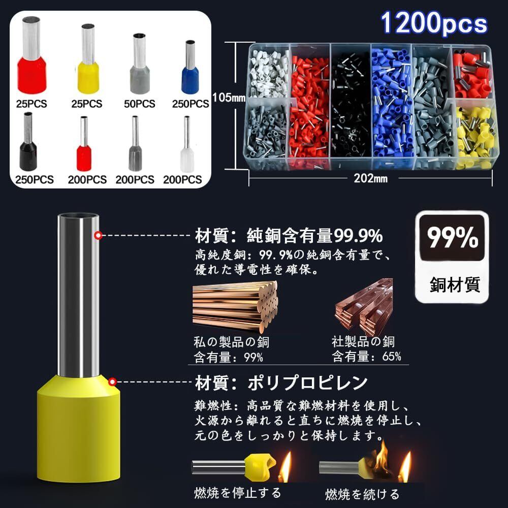 豊富な端子セット:セットには1200個の絶縁端子が含まれており、8つの異なるサイズの端子が揃っています:E0508 (0.5mm²)、E7508 (0.75mm²)、E1008 (1.0mm²)、E1508 (1.5mm²)、E2508 (2.5mm²)、E4009 (4.0mm²)、E6012 (6.0mm²) および E10-12 (10mm²)。これらの端子は絶縁カバーを備えており、さまざまな電線接続の問題を迅速に解決し、さまざまなニーズに対応します。