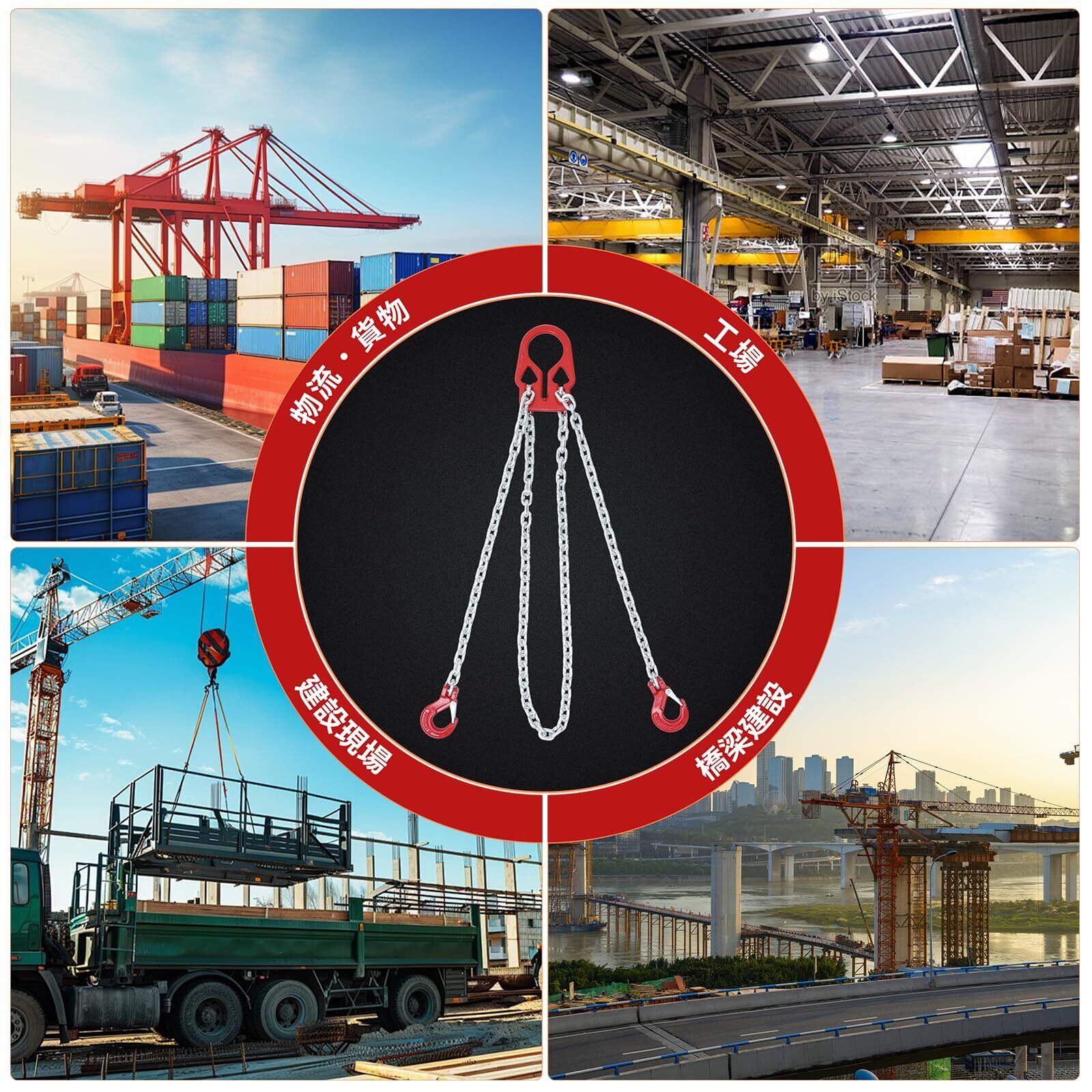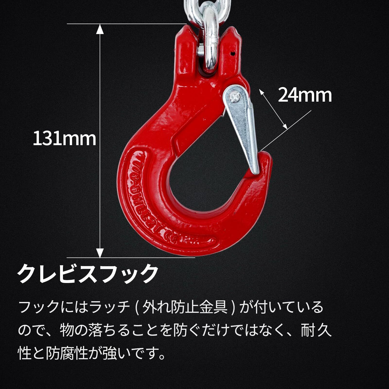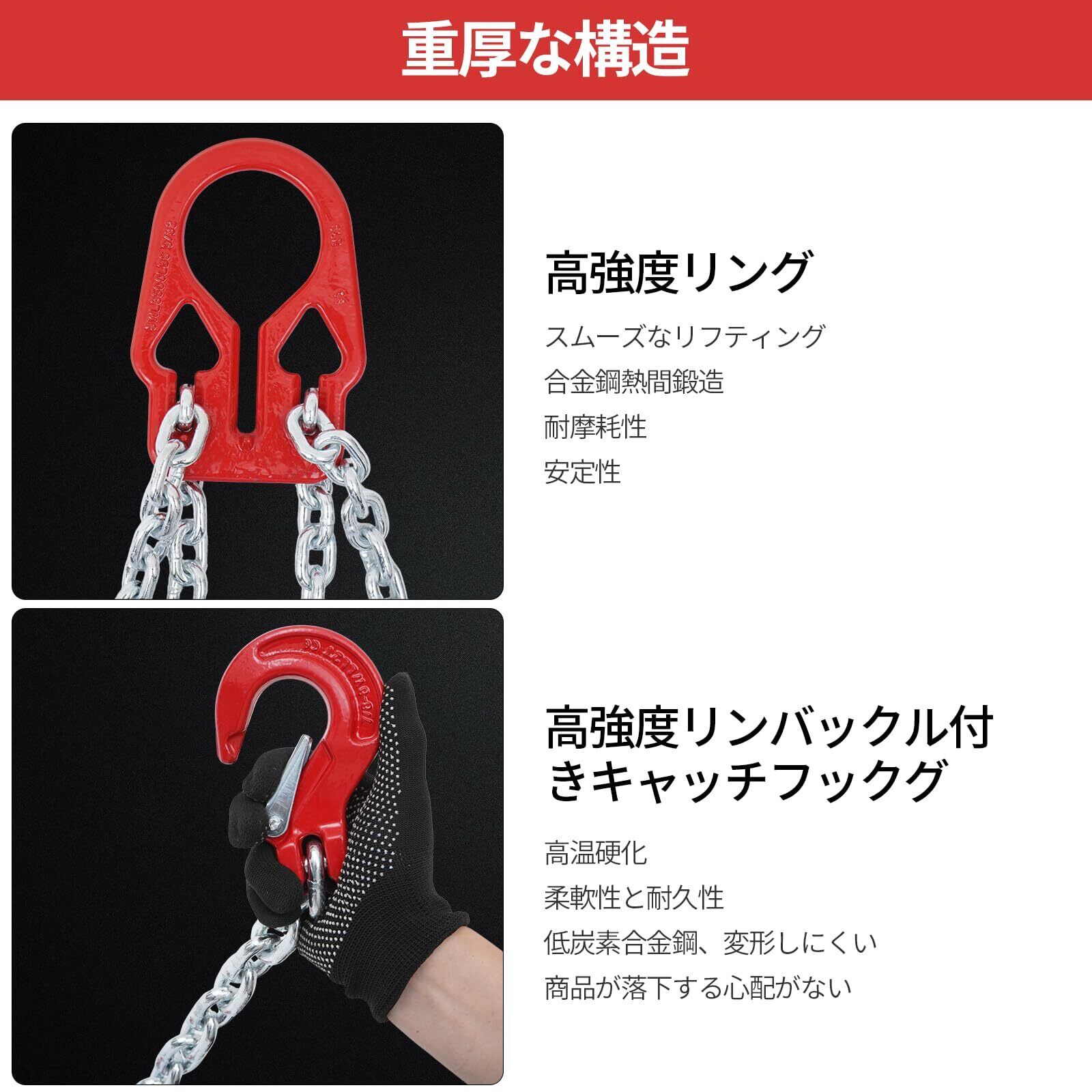 高強度なスチール素材を採用:チェーンは自在性に優れ、適切な2本吊りフックでスピーディーかつ確実な吊り荷作業が行えます