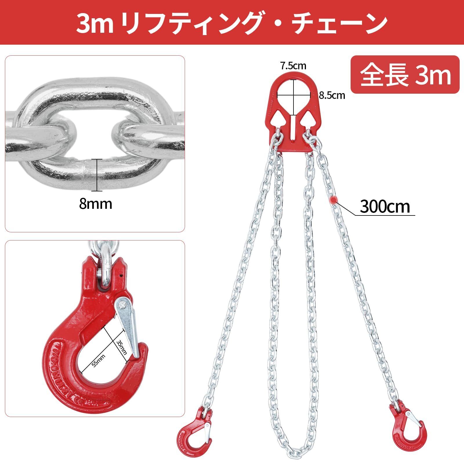 サイズ:定格荷重:3.18t チェーンの長さ: 3m チェーンの直径:8mm