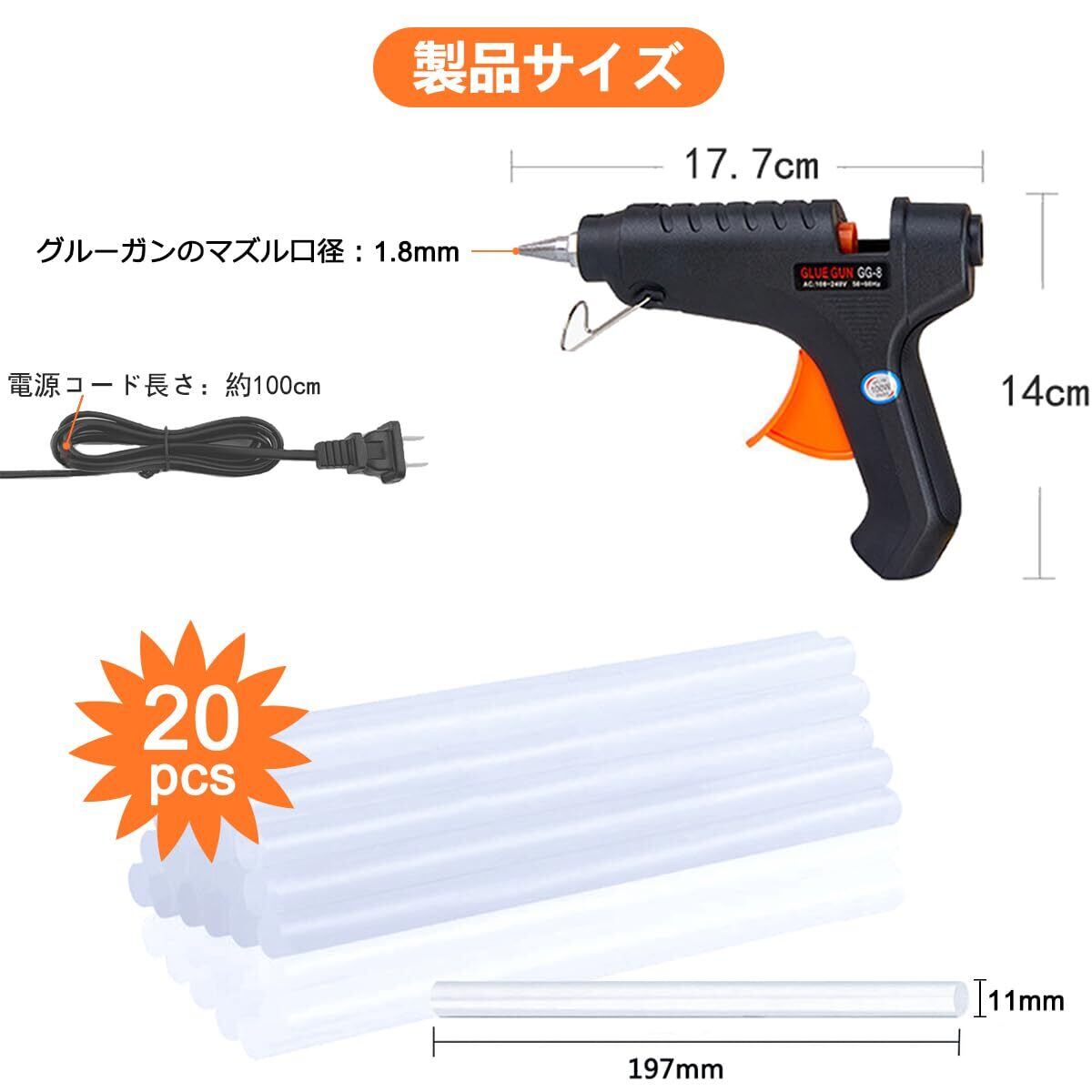 【製品仕様】本体サイズ:約17.7cmx14cm: 接着剤スティックサイズ:197*11mm; 定格入力パワー: 100W; 加熱温度:180℃; 電源コード長さ:約100cm; グルーガンの本体重さ:約195g;適合グルースティックの直径:11mm(+0.3/-0.3mm); パッケージ内容物:グルーガン*1、接着剤スティック*20本。