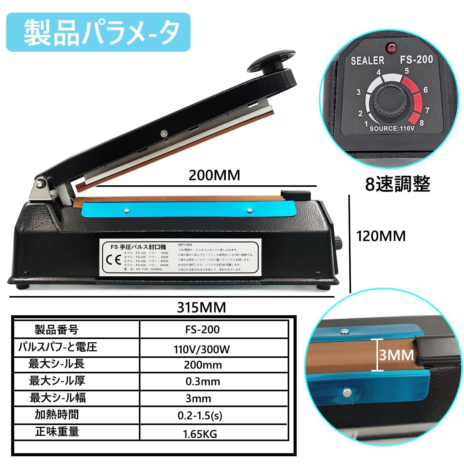 【製品仕様パラメータ】機械サイズ: 315×85×145mm、最大シール長:200MM、シール幅:3MM、材質:金属鉄シェル、重量:1.65kg、カラー:黑、加熱時間:0.2-1.5秒、梱包内容:インパルスシーラー×1、予備電熱線キット×5、取扱説明書×1。シールのみ、切断機能なし。ご注意ください!