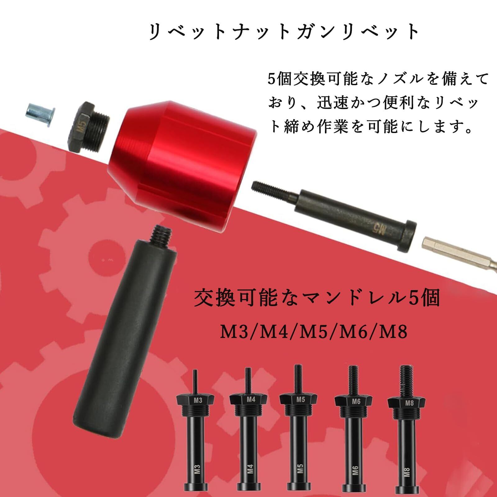 M3 /M4 / M5 / M6 / M8ノズル、高硬度六角コネクティングロッド。5 つの交換可能なノズルを備えており、迅速かつ便利なリベット締め作業を可能にします。