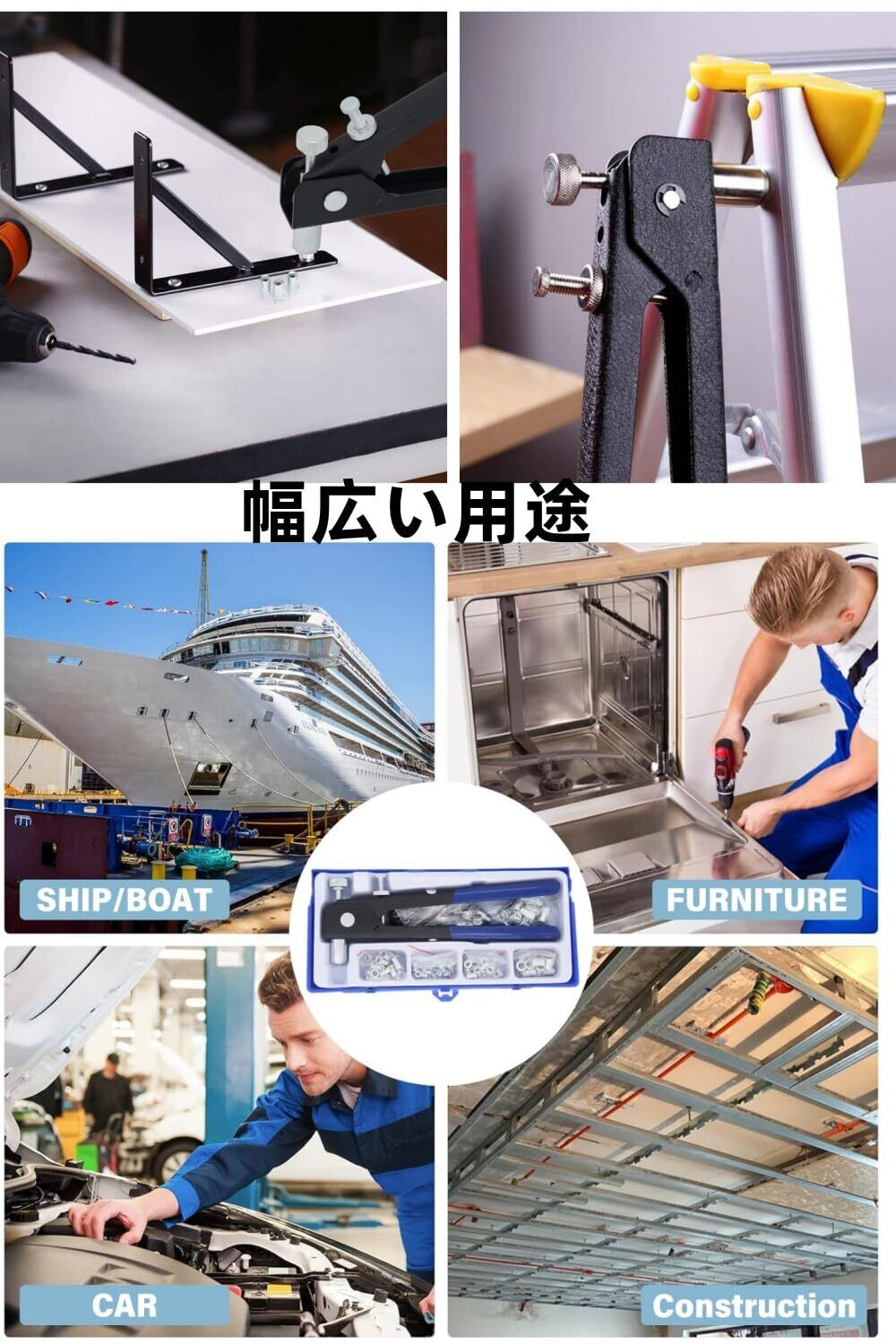 【幅広い用途】ボディパネル、自転車部品、家具、装飾品、自動車、トレーラー、船舶建築など、様々な場面で活躍する汎用リベットナットツール。DIYからプロのメンテナンス作業まで幅広く対応します。