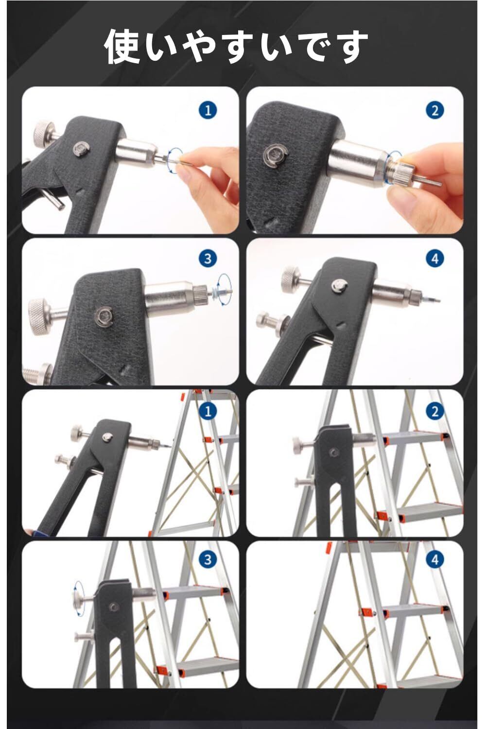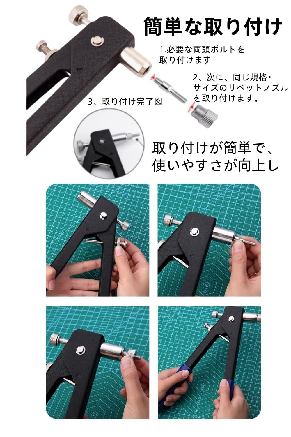 【簡単な取り付け】作業対象に下穴を開け、適切なサイズのリベットナットを工具にセットして差し込み、ハンドルを押し込むだけで取り付け完了。薄い素材や裏面からの作業が難しい場合にも最適です。さらに、芯軸の交換も手動で簡単に行え、効率的な作業が可能です。